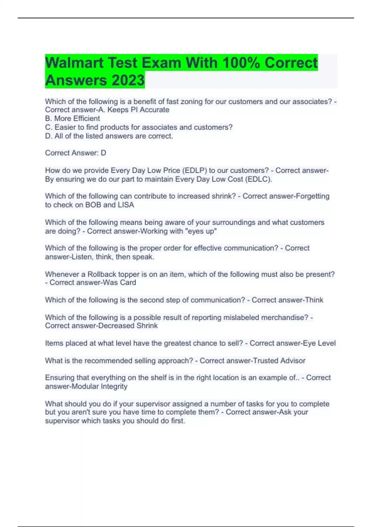 Walmart Test Exam With 100% Correct Answers 2023