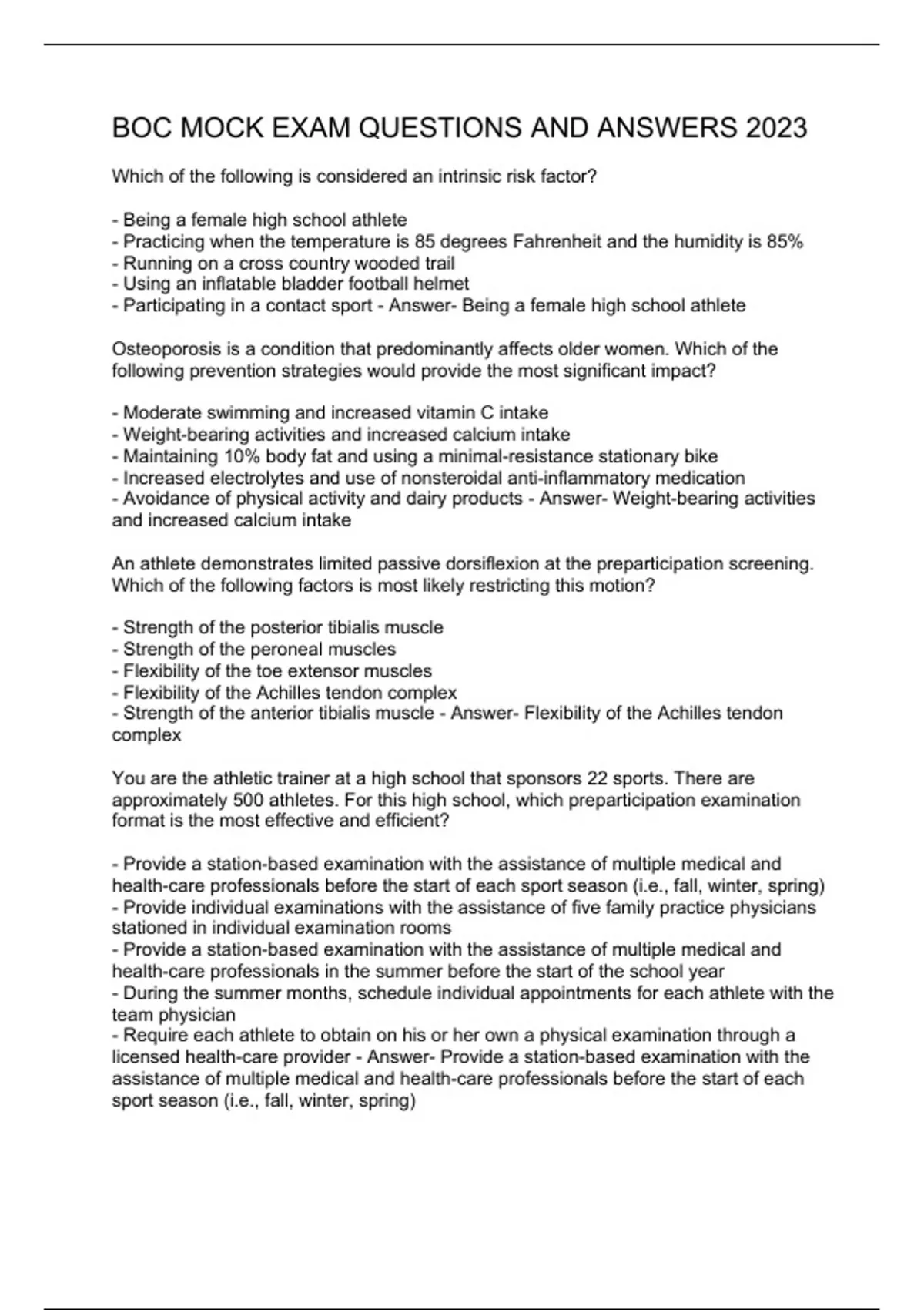 Which of the following is considered an intrinsic risk factor? - Being a female high school athlete - Practicing when the temperature is 85 degrees Fahrenheit and the humidity is 85% - Running on a cross country wooded trail - Using an inflatable bladder football helmet - Participating in a contact sport - Answer- Being a female high school athlete Osteoporosis is a condition that predominantly affects older women. Which of the following prevention strategies would provide the most significant impact? - Moderate swimming and increased vitamin C intake - Weight-bearing activities and increased calcium intake - Maintaining 10% body fat and using a minimal-resistance stationary bike - Increased electrolytes and use of nonsteroidal anti-inflammatory medication - Avoidance of physical activity and dairy products - Answer- Weight-bearing activities and increased calcium intake An athlete demonstrates limited passive dorsiflexion at the preparticipation screening. Which of the following factors is most likely restricting this motion? - Strength of the posterior tibialis muscle - Strength of the peroneal muscles - Flexibility of the toe extensor muscles - Flexibility of the Achilles tendon complex - Strength of the anterior tibialis muscle - Answer- Flexibility of the Achilles tendon complex You are the athletic trainer at a high school that sponsors 22 sports. There are approximately 500 athletes. For this high school, which preparticipation examination format is the most effective and efficient? - Provide a station-based examination with the assistance of multiple medical and health-care professionals before the start of each sport season (i.e., fall, winter, spring) - Provide individual examinations with the assistance of five family practice physicians stationed in individual examination rooms - Provide a station-based examination with the assistance of multiple medical and health-care professionals in the summer before the start of the school year - During the summer months, schedule individual appointments for each athlete with the team physician - Require each athlete to obtain on his or her own a physical examination through a licensed health-care provider - Answer- Provide a station-based examination with the assistance of multiple medical and health-care professionals before the start of each sport season (i.e., fall, winter, spring)