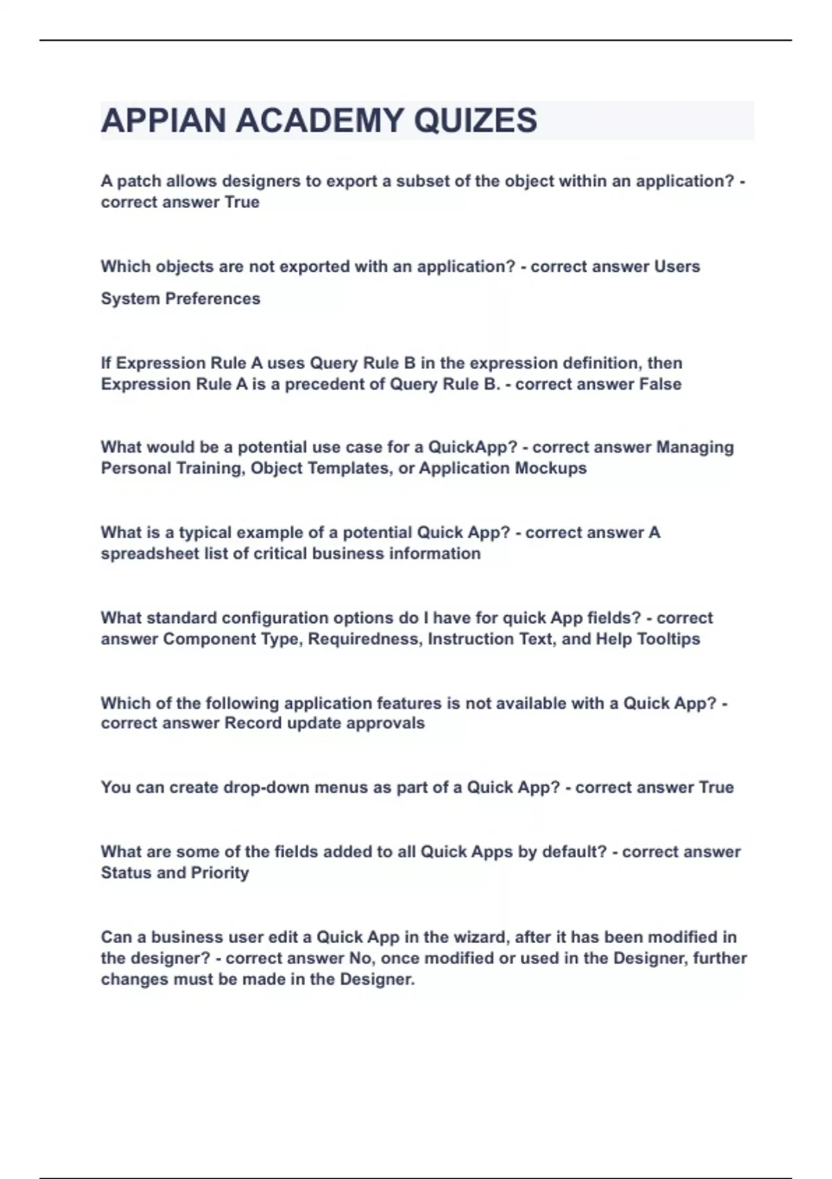 A patch allows designers to export a subset of the object within an application? True Which objects are not exported with an application? Users System Preferences If Expression Rule A uses Query Rule B in the expression definition, then Expression Rule A is a precedent of Query Rule B. False What would be a potential use case for a QuickApp? Managing Personal Training, Object Templates, or Application Mockups What is a typical example of a potential Quick App? A spreadsheet list of critical business information What standard configuration options do I have for quick App fields? Component Type, Requiredness, Instruction Text, and Help Tooltips Which of the following application features is not available with a Quick App? Record update approvals You can create drop-down menus as part of a Quick App? True What are some of the fields added to all Quick Apps by default? Status and Priority Can a business user edit a Quick App in the wizard, after it has been modified in the designer? No, once modified or used in the Designer, further changes must be made in the Designer. What is the best way for a business user to Update a Quick App with a new field or delete an existing field? Click the application name in the Quick App Designer and relaunch the wizard. Can I directly edit just the forms or other individual components of a Quick App? Quick Apps are fully editable from the Appian Designer view. Where do you got to configure the data source for your Quick Apps? Administration Console What's the data source in your Quick App used for? Storing business data from the app into a database Creating an Appian CDT automatically can be done using which of the following objects? Database tables, database views, Appian plugins, or SOAP WSDLs With CDTs mapped to database tables, how do I specify that a field is a unique identifier that is automatically incremented by the database itself? Select the auto-generate checkbox after clicking the Primary Key icon Which of the following are advantages to using CDTs in your application data designs, versus unstructured fields? You can aggregate and report on data based on individual details You can validate the information provided by the user and prompt them to make corrections You can present lookup information, so that the user can select values instead of typing them An address would best be stored into which of the following variable? A single variable named "address" using a CDT containing elements for streetNumber, streetName, apartment Number, city, state, and postCode Creating a CDT from scratch in the Data Type Designer requires which of the following elements? A namespace, a name, description (optional), and a sequence of fields When Naming a Data Type element in Appian (or when naming variables) what naming convention is a standard practice? camelCase What is a Custom Data Type (CDT)? A user-defined logical grouping of related data, used to structure variables Which of the following statements is true regarding Custom Data Types (CDTs)? CDTs use industry standard format (XSD), useful for communicating with web services and relational databases When Naming a Data Type, which of the following names follows the best practices for application prefixes and capitalization? APP_DataTypeName In which of the following ways can a CDT be created? Manually, by a user Generated from a database table Duplicated from an existing CDT The primary key is the field in one CDT that uniquely identifies a row in another CDT. False