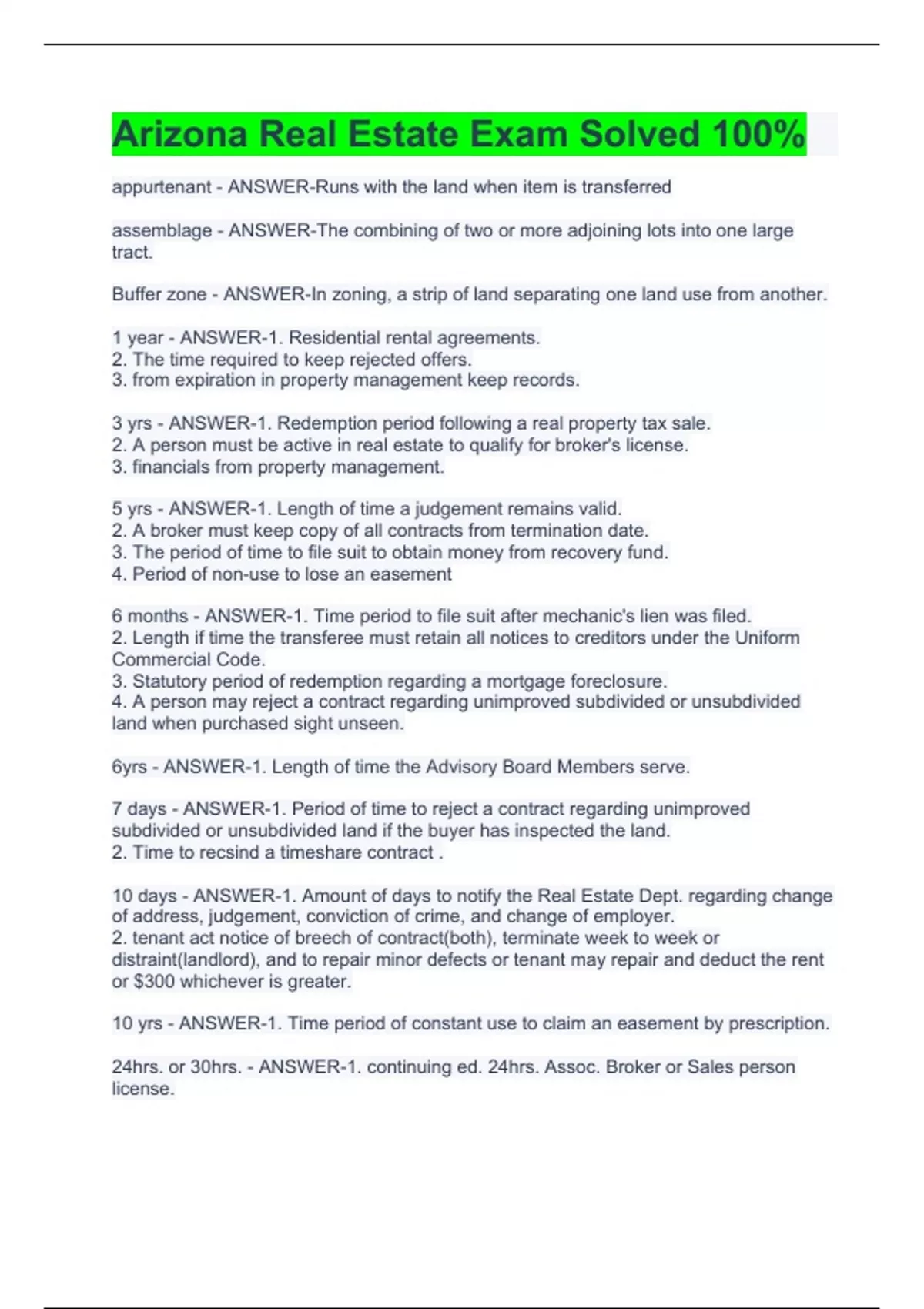 appurtenant - ANSWER-Runs with the land when item is transferred assemblage - ANSWER-The combining of two or more adjoining lots into one large tract. Buffer zone - ANSWER-In zoning, a strip of land separating one land use from another. 1 year - ANSWER-1. Residential rental agreements. 2. The time required to keep rejected offers. 3. from expiration in property management keep records. 3 yrs - ANSWER-1. Redemption period following a real property tax sale. 2. A person must be active in real estate to qualify for broker's license. 3. financials from property management. 5 yrs - ANSWER-1. Length of time a judgement remains valid. 2. A broker must keep copy of all contracts from termination date. 3. The period of time to file suit to obtain money from recovery fund. 4. Period of non-use to lose an easement 6 months - ANSWER-1. Time period to file suit after mechanic's lien was filed. 2. Length if time the transferee must retain all notices to creditors under the Uniform Commercial Code. 3. Statutory period of redemption regarding a mortgage foreclosure. 4. A person may reject a contract regarding unimproved subdivided or unsubdivided land when purchased sight unseen. 6yrs - ANSWER-1. Length of time the Advisory Board Members serve. 7 days - ANSWER-1. Period of time to reject a contract regarding unimproved subdivided or unsubdivided land if the buyer has inspected the land. 2. Time to recsind a timeshare contract . 10 days - ANSWER-1. Amount of days to notify the Real Estate Dept. regarding change of address, judgement, conviction of crime, and change of employer. 2. tenant act notice of breech of contract(both), terminate week to week or distraint(landlord), and to repair minor defects or tenant may repair and deduct the rent or $300 whichever is greater. 10 yrs - ANSWER-1. Time period of constant use to claim an easement by prescription. 24hrs. or 30hrs. - ANSWER-1. continuing ed. 24hrs. Assoc. Broker or Sales person license.