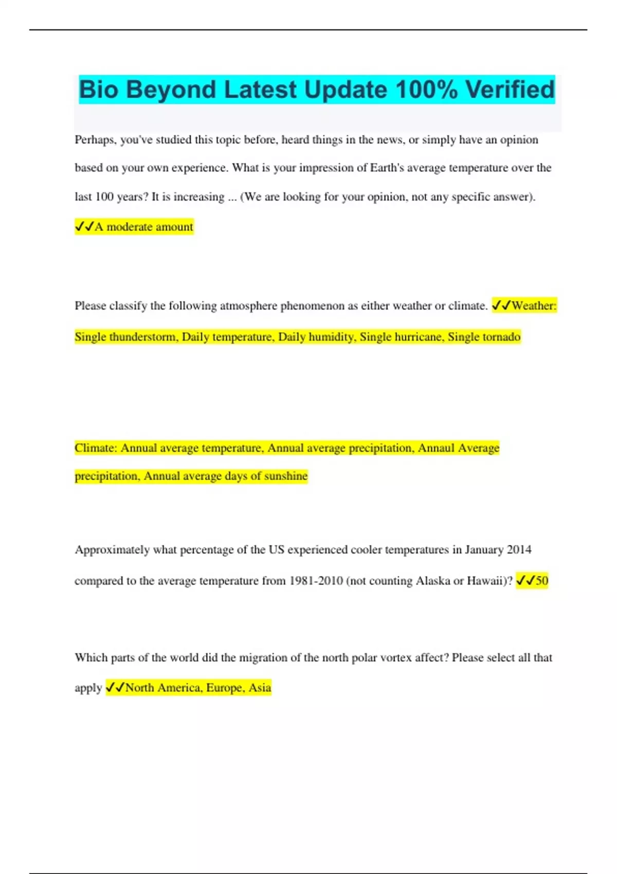 Bio Beyond Latest Update 100% Verified Perhaps, you've studied this topic before, heard things in the news, or simply have an opinion based on your own experience. What is your impression of Earth's average temperature over the last 100 years? It is increasing ... (We are looking for your opinion, not any specific answer). A moderate amount Please classify the following atmosphere phenomenon as either weather or climate. Weather: Single thunderstorm, Daily temperature, Daily humidity, Single hurricane, Single tornado Climate: Annual average temperature, Annual average precipitation, Annaul Average precipitation, Annual average days of sunshine Approximately what percentage of the US experienced cooler temperatures in January 2014 compared to the average temperature from (not counting Alaska or Hawaii)? 50 Which parts of the world did the migration of the north polar vortex affect? Please select all that apply North America, Europe, Asia How many years from 2000 forward had an average land temperature above the 20th century average? 16 Take another look at the graph. Instead of focusing on individual years, do the data suggest an overall trend for North America? Higher temperatures are more frequent in the US What are some observations you can make about McGall Glacier? The tip of the glacier has retreated over time On most days, the Atlantic Ocean off the eastern coast of the United States is what compared to the average? Warmer As you just learned, the waters off the coast of the US are getting warmer. Do you think this is having an effect on coral reefs? yes Reflecting on the data you just observed on the prior screen, which of the causes of coral bleaching will become more frequent and powerful? Select all that apply: Increased water temperature Overexposure to sunlight Drag and drop the the three coral states below to show the transition from healthy coral to bleached coral. Examine the Florida panhandle indicated by the arrow on the map. If you went snorkeling in 2015, what might you have seen based on the information from this map? Abundant bleached coral with some not recovering. Based on what you've seen so far, how do you think these changes relate to Climate Change? Coincidence Hypothesis: If Earth's temperature is increasing, what would you expect is happening around Australia and New Zealand in the following areas? What patterns (or trends) do you notice in the graph? Select all that apply. Higher temperatures are more frequent in Australia What trend do you see in the map? Cooling is limited to a small region Think back to what you saw about glaciers in the US. How does the change in New Zealand glaciers compare? Both US and New Zealand glaciers are shrinking What patterns (or trends) do you notice in the graph over time? Select all that apply. 1.The sizes of the warmer anomalies are increasing 2.Higher temperatures are more frequent now 3.The sizes of the cooler anomalies are decreasing Do you notice anything about the distributution of bleaching? The bleaching gets worse the further north you go Now that you have observed a change in the temperature around the reef and a change in distribution of the bleaching, what might be happening? Select all that apply. 1.The water around the northern part of the reef is more polluted 2.The water around the northern part of of the reef is warming the most Do these data from Australia and New Zealand support your hypothesis? No, these data do not support my hypothesis Are the data from multiple places around the world consistent with what you have already seen? 1.The size of the warming anomalies is increasing 2.Higher temperatures are more frequent globaly What is the trend in the Reference Glacier data? Glaciers are decreasing in mass Where do you think most of the liquid water from these melting glaciers ends up? Oceans What is the pattern in all three lines on the graph? Heat content is increasing According to the map above, which areas are at highest risk for bleaching? Hint: orient yourself to the equator, which goes through the map horizontally and makes a roughly equal top and bottom. Select all that apply. 1.Northern Pacific Ocean 2.Northern Atlantic Ocean 3.Coral Sea Shown to the right is a second map, with red dots showing the location of reefs worldwide. Which areas you identified above also contain large concentrations of corals? Select all that apply. Coral Sea Northern Pacific Ocean Do these global data support your hypothesis? No, these data do not support my hypothesis t's time to put it all together. Use what you have learned in this lesson to create a conclusion below. warming,melting,warming, experiencing bleaching