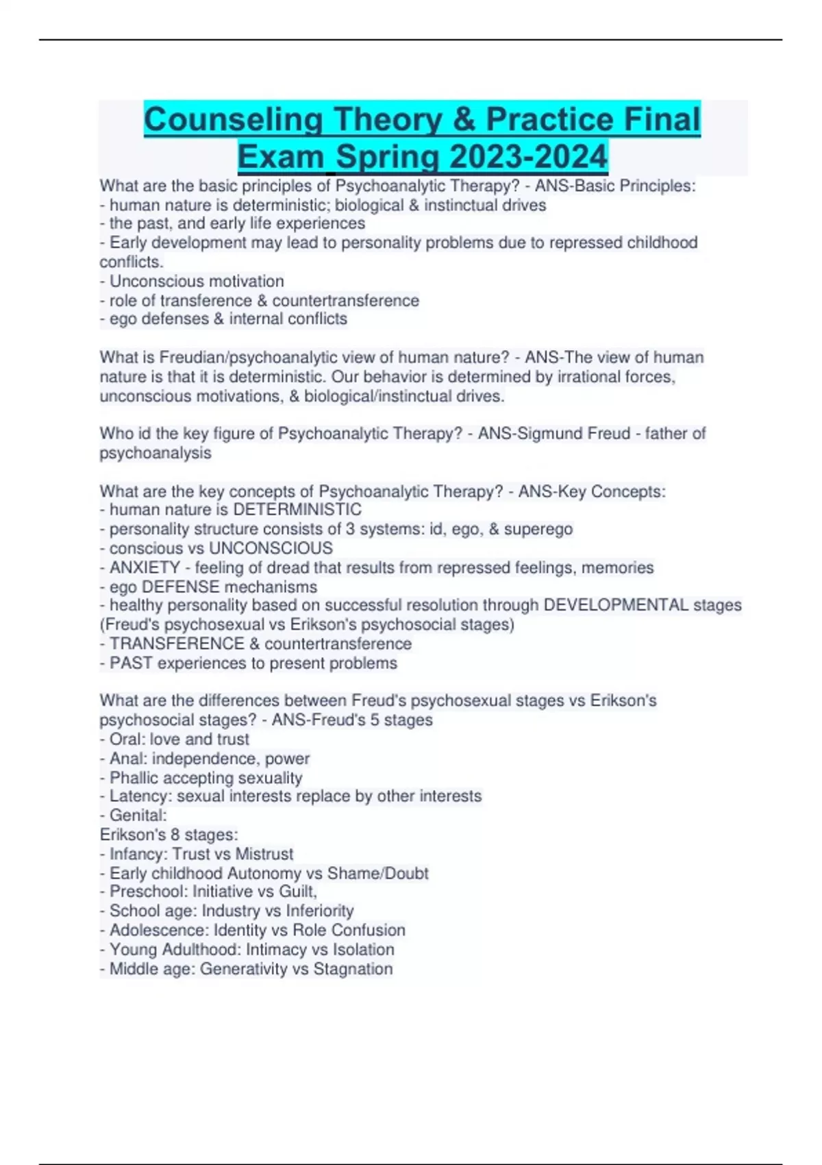 Counseling Theory & Practice Final Exam Spring What are the basic principles of Psychoanalytic Therapy? - ANS-Basic Principles: - human nature is deterministic; biological & instinctual drives - the past, and early life experiences - Early development may lead to personality problems due to repressed childhood conflicts. - Unconscious motivation - role of transference & countertransference - ego defenses & internal conflicts What is Freudian/psychoanalytic view of human nature? - ANS-The view of human nature is that it is deterministic. Our behavior is determined by irrational forces, unconscious motivations, & biological/instinctual drives. Who id the key figure of Psychoanalytic Therapy? - ANS-Sigmund Freud - father of psychoanalysis What are the key concepts of Psychoanalytic Therapy? - ANS-Key Concepts: - human nature is DETERMINISTIC - personality structure consists of 3 systems: id, ego, & superego - conscious vs UNCONSCIOUS - ANXIETY - feeling of dread that results from repressed feelings, memories - ego DEFENSE mechanisms - healthy personality based on successful resolution through DEVELOPMENTAL stages (Freud's psychosexual vs Erikson's psychosocial stages) - TRANSFERENCE & countertransference - PAST experiences to present problems What are the differences between Freud's psychosexual stages vs Erikson's psychosocial stages? - ANS-Freud's 5 stages - Oral: love and trust - Anal: independence, power - Phallic accepting sexuality - Latency: sexual interests replace by other interests - Genital: Erikson's 8 stages: - Infancy: Trust vs Mistrust - Early childhood Autonomy vs Shame/Doubt - Preschool: Initiative vs Guilt, - School age: Industry vs Inferiority - Adolescence: Identity vs Role Confusion - Young Adulthood: Intimacy vs Isolation - Middle age: Generativity vs Stagnation - Later Life: Integrity vs Despair What are the therapeutic goals of Psychoanalytic Therapy? - ANS-1) Make unconscious conscious 2) Strengthen ego through analysis of resistance & transference 3) Restructuring of personality (rather than solving immediate problems) What is the role of the therapist in Psychoanalytic Therapy?...