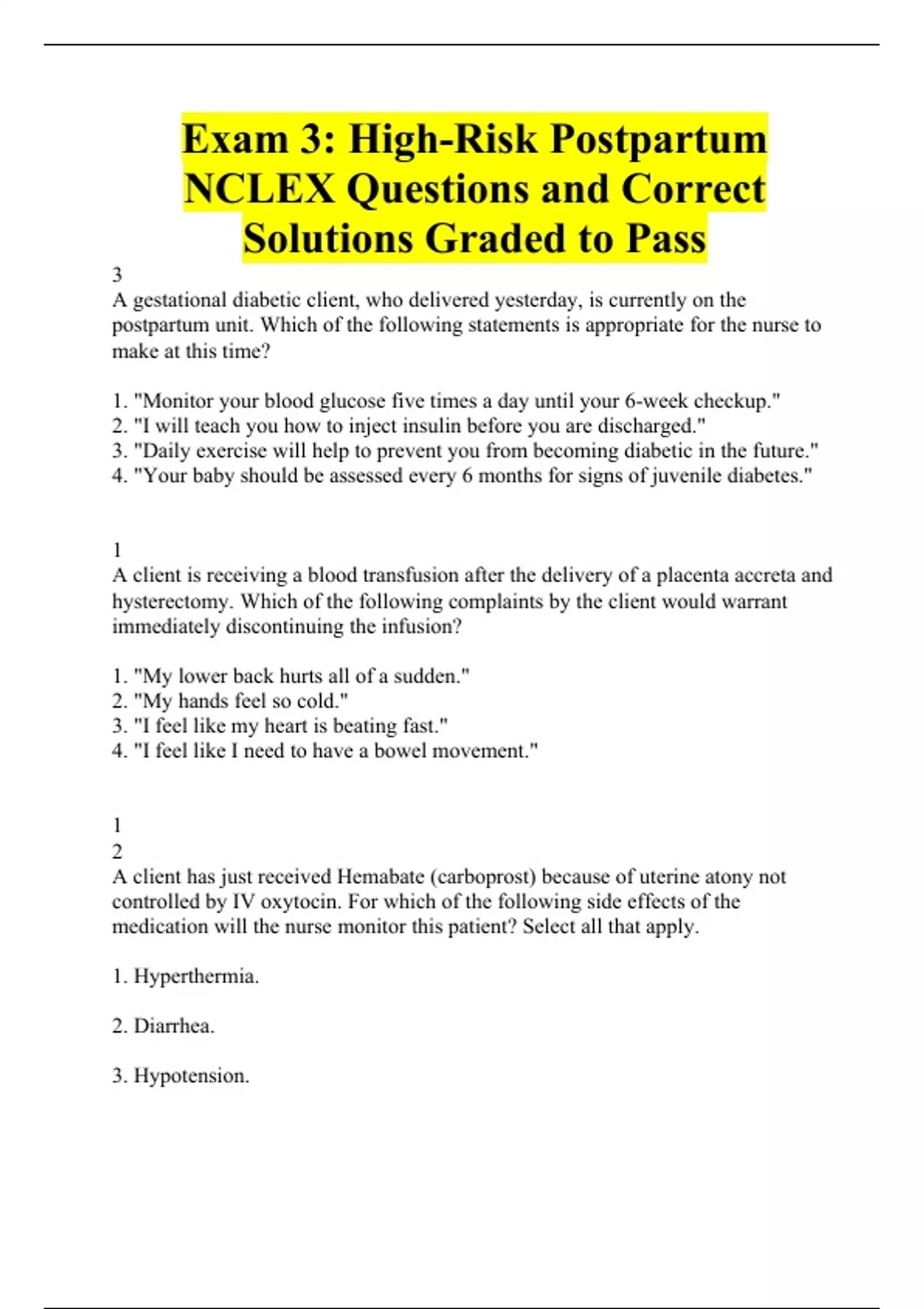 Exam 3: High-Risk Postpartum NCLEX Questions and Correct Solutions Graded to Pass
