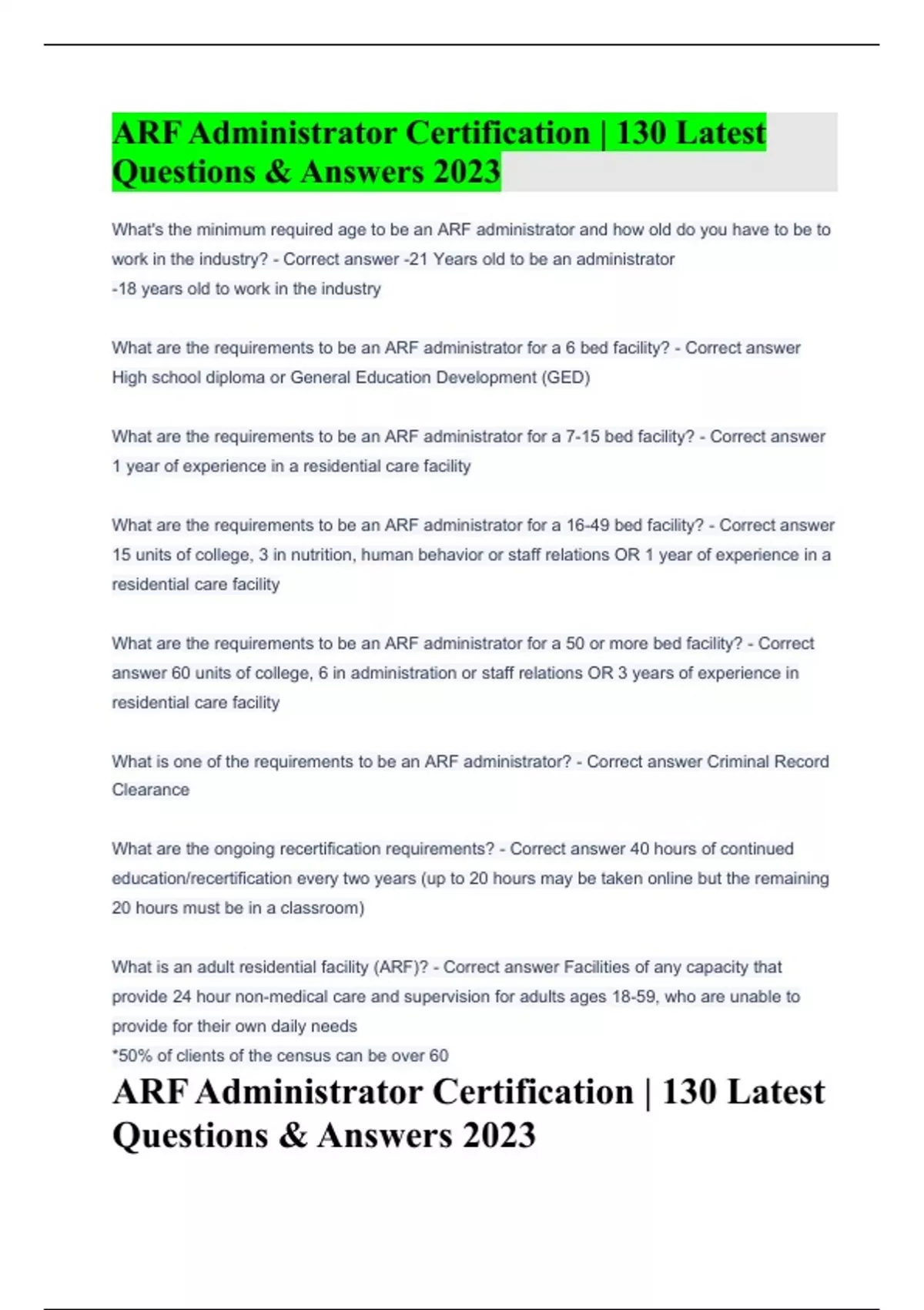 ARF Administrator Certification | 130 Latest Questions & Answers 2023 What is an Administrator? - Correct answer A licensee, or the adult designated by the licensee to act in his/her behalf in the overall management of the facility (*adult means a person who is 18 years of age or older, duh.)