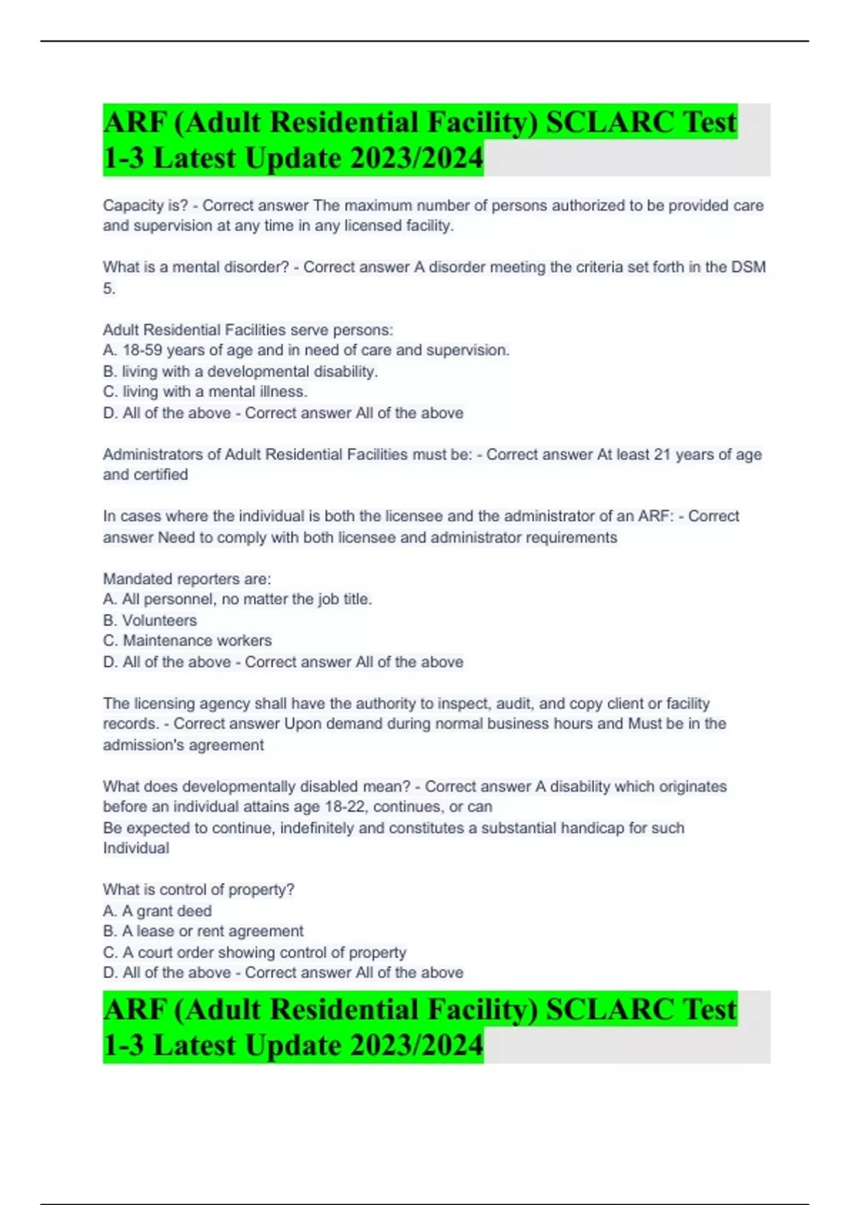 ARF (Adult Residential Facility) SCLARC Test 1-3 Latest Update 2023/2024ARF (Adult Residential Facility) SCLARC Test 1-3 Latest Update 2023/2024