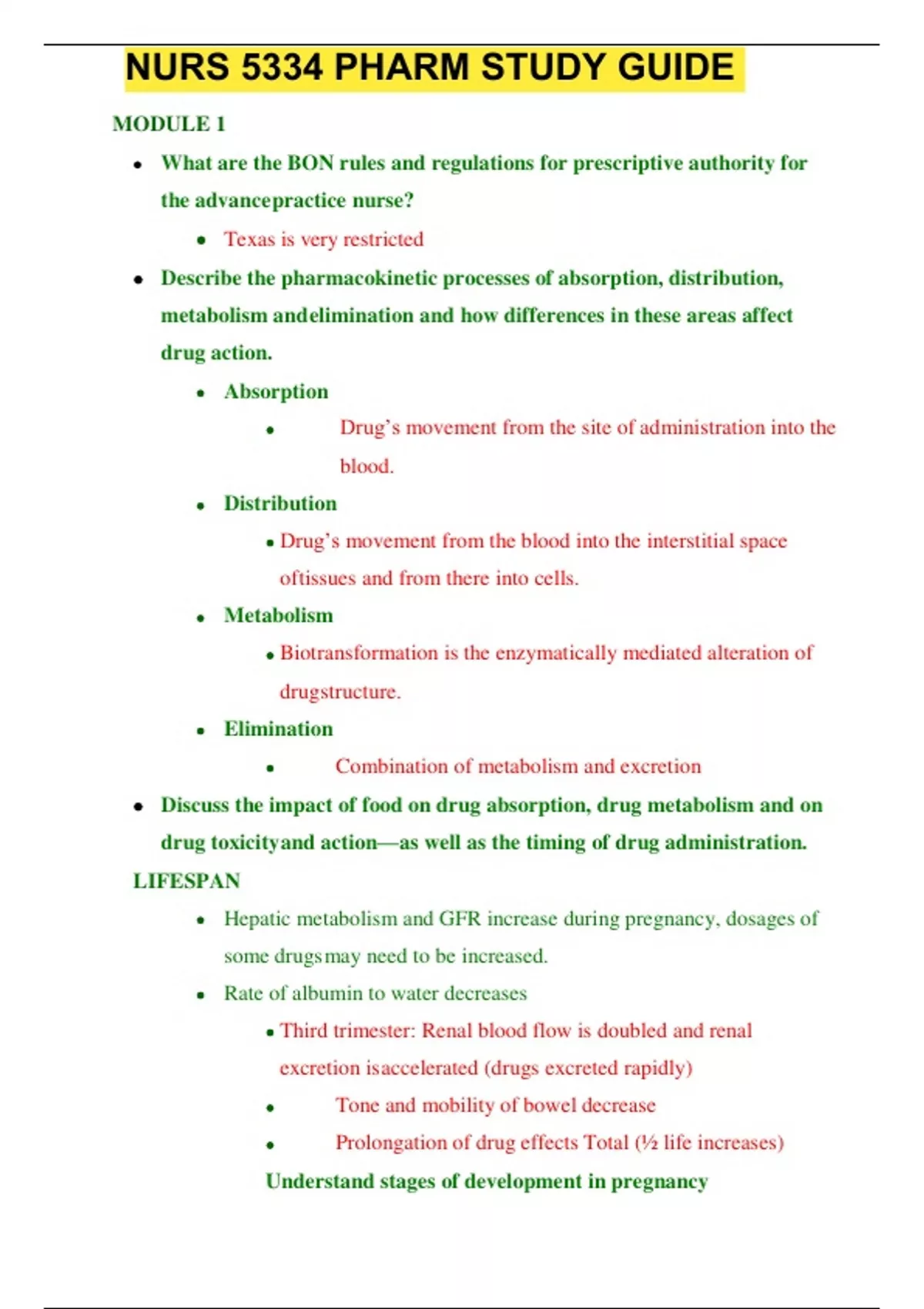 NURS 5334 PHARM STUDY GUIDE QUIZ 1 ALREADY GRADED A NURS 5334 PHARM MODULE 1 • What are the BON rules and regulations for prescriptive authority for the advance practice nurse? • Texas is very restricted • Describe the pharmacokinetic processes of absorption, distribution, metabolism and elimination and how differences in these areas affect drug action. • Absorption • Drug’s movement from the site of administration into the blood. • Distribution • Drug’s movement from the blood into the interstitial space of tissues and from there into cells. • Metabolism • Biotransformation is the enzymatically mediated alteration of drug structure. • Elimination • Combination of metabolism and excretion • Discuss the impact of food on drug absorption, drug metabolism and on drug toxicity and action—as well as the timing of drug administration. LIFESPAN • Hepatic metabolism and GFR increase during pregnancy, dosages of some drugs may need to be increased. • Rate of albumin to water decreases • Third trimester: Renal blood flow is doubled and renal excretion is accelerated (drugs excreted rapidly) • Tone and mobility of bowel decrease • Prolongation of drug effects Total (½ life increases) Understand stages of development in pregnancy • Conception: through week 2 • Embryonic period: week 3-week 8 a) Gross malformations can be produced by teratogens • Fetal period: week 9-delivery • Understand pregnancy labeling • 3 categories now a) Pregnancy, lactation, male & female reproductive potential • How do you decrease risk in the infant during breastfeeding? • Take meds immediately after breastfeeding, avoid drugs that have long half-lives, choose drugs that tend to be excluded from milk, avoid drugs that are known to be hazardous. • How do pediatric patients differ in their response to medications? • Absorption a) Oral? • Neonates: drug remain in the stomach longer which increases the levels, low acidity can affect the absorption of acid labile drugs b) Parenteral? • Reponses are slow and erratic. • Infancy: absorption is more rapid than in neonates & adults • Best avoided in infants c) Transdermal? • Greater skin permeability which increases topical drug absorption and increases the risk for toxicity • Distribution a) Protein binding 1. Neonates: less protein-binding—increased availability of highly protein bound drugs such as phenytoin, diazepam, and phenobarbital. Reduced dosages needed in these highly bound drugs. b) Blood Brain Barrier 1. Not fully developed at birth, drugs have easy access to the CNS, doses should be reduced. • Metabolism a) Hepatic function? 1. Liver hasn’t reached full maturation—sensitive to drugs eliminated by the CYP450. Liver’s ability to metabolize drugs increases about one month after birth. b