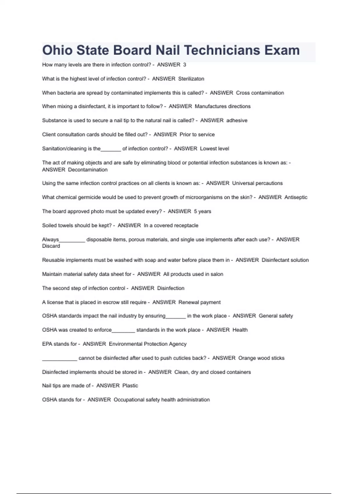 Ohio State Board Nail Technicians Exam With 100 % Correct Answers latest version 2023/2024