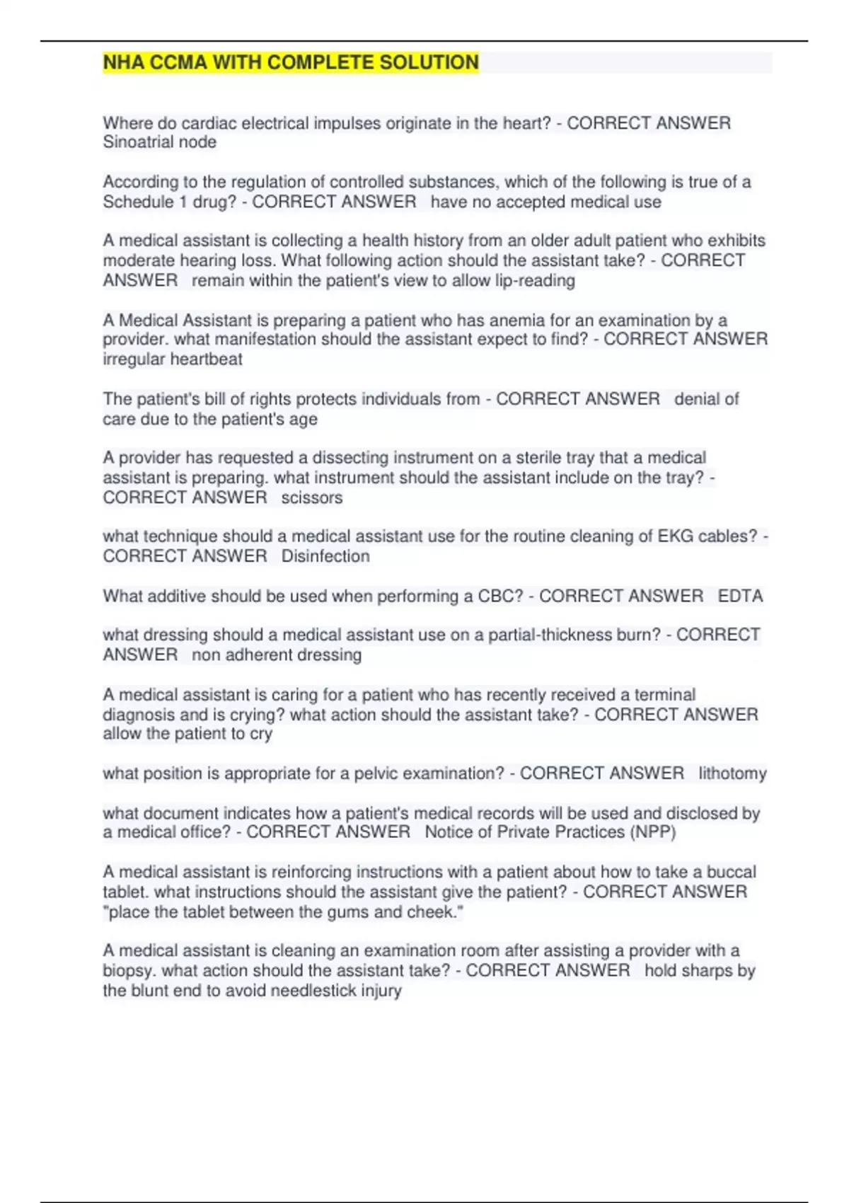 NHA CCMA WITH COMPLETE SOLUTION Where do cardiac electrical impulses originate in the heart? - CORRECT ANSWER Sinoatrial node According to the regulation of controlled substances, which of the following is true of a Schedule 1 drug? - CORRECT ANSWER have no accepted medical use A medical assistant is collecting a health history from an older adult patient who exhibits moderate hearing loss. What following action should the assistant take? - CORRECT ANSWER remain within the patient's view to allow lip-reading A Medical Assistant is preparing a patient who has anemia for an examination by a provider. what manifestation should the assistant expect to find? - CORRECT ANSWER irregular heartbeat The patient's bill of rights protects individuals from - CORRECT ANSWER denial of care due to the patient's age A provider has requested a dissecting instrument on a sterile tray that a medical assistant is preparing. what instrument should the assistant include on the tray? - CORRECT ANSWER scissors what technique should a medical assistant use for the routine cleaning of EKG cables? - CORRECT ANSWER Disinfection What additive should be used when performing a CBC? - CORRECT ANSWER EDTA what dressing should a medical assistant use on a partial-thickness burn? - CORRECT ANSWER non adherent dressing A medical assistant is caring for a patient who has recently received a terminal diagnosis and is crying? what action should the assistant take? - CORRECT ANSWER allow the patient to cry
