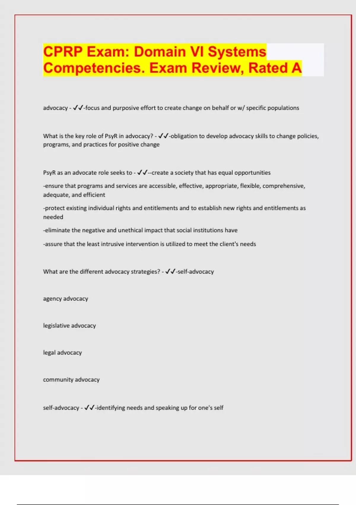 CPRP Exam: Domain VI Systems Competencies. Exam Review, Rated A advocacy - -focus and purposive effort to create change on behalf or w/ specific populations What is the key role of PsyR in advocacy? - -obligation to develop advocacy skills to change policies, programs, and practices for positive change PsyR as an advocate role seeks to - --create a society that has equal opportunities -ensure that programs and services are accessible, effective, appropriate, flexible, comprehensive, adequate, and efficient -protect existing individual rights and entitlements and to establish new rights and entitlements as needed -eliminate the negative and unethical impact that social institutions have -assure that the least intrusive intervention is utilized to meet the client's needs What are the different advocacy strategies? - -self-advocacy agency advocacy legislative advocacy legal advocacy community advocacy self-advocacy - -identifying needs and speaking up for one's self