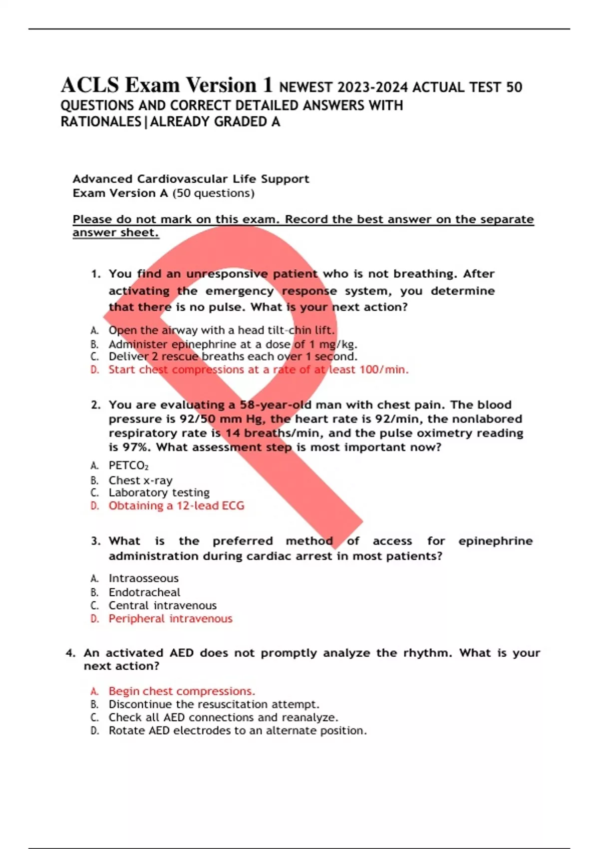 ACLS Exam Version 1 NEWEST ACTUAL TEST 50 QUESTIONS AND CORRECT DETAILED ANSWERS WITH RATIONALES|ALREADY GRADED A