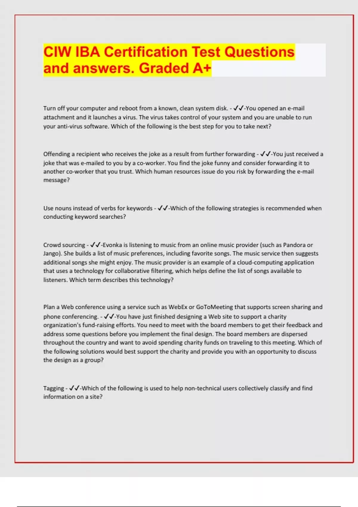 CIW IBA Certification Test Questions and answers. Graded A+ Turn off your computer and reboot from a known, clean system disk. - -You opened an e-mail attachment and it launches a virus. The virus takes control of your system and you are unable to run your anti-virus software. Which of the following is the best step for you to take next? Offending a recipient who receives the joke as a result from further forwarding - -You just received a joke that was e-mailed to you by a co-worker. You find the joke funny and consider forwarding it to another co-worker that you trust. Which human resources issue do you risk by forwarding the e-mail message? Use nouns instead of verbs for keywords - -Which of the following strategies is recommended when conducting keyword searches? Crowd sourcing - -Evonka is listening to music from an online music provider (such as Pandora or Jango). She builds a list of music preferences, including favorite songs. The music service then suggests additional songs she might enjoy. The music provider is an example of a cloud-computing application that uses a technology for collaborative filtering, which helps define the list of songs available to listeners. Which term describes this technology? Plan a Web conference using a service such as WebEx or GoToMeeting that supports screen sharing and phone conferencing. - -You have just finished designing a Web site to support a charity organization's fund-raising efforts. You need to meet with the board members to get their feedback and address some questions before you implement the final design. The board members are dispersed throughout the country and want to avoid spending charity funds on traveling to this meeting. Which of the following solutions would best support the charity and provide you with an opportunity to discuss the design as a group? Tagging - -Which of the following is used to help non-technical users collectively classify and find information on a site? Request that the customer send his complaints by e-mail, knowing that any inappropriate communication will be well documented. - -You received a text and a threatening voicemail from an angry customer who wants to immediately discuss the shortcomings of a recently released product. You are about to walk into a mandatory meeting with your top-level leadership team. Which of the following is your best course of action? Before opening the attachment, call or send a text or instant message to the individual to verify that he or she meant to send it. - -Raoul has received a file attachment from a known individual. H. has no reason to expect files from this individual. Which of the following is an effective security strategy for Raoul to take? E-mail address, SMTP, POP3, user name and password - -You accidentally dropped your mobile phone, which was submerged in water and no longer works. Upon replacing the phone with an upgraded unit you must reconfigure many of the services. The instructions say that all you need to do is enter your e-mail address and the unit will configure the e-mail client for you. Even though you have tried this several times, it