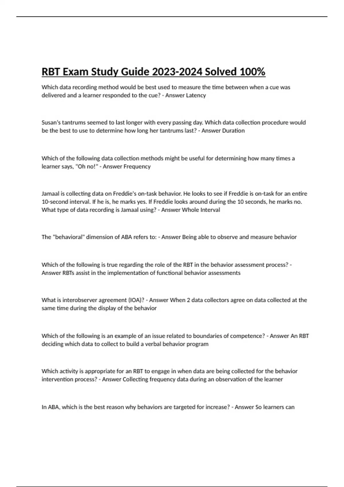 Which data recording method would be best used to measure the time between when a cue was delivered and a learner responded to the cue? - Answer Latency Susan's tantrums seemed to last longer with every passing day. Which data collection procedure would be the best to use to determine how long her tantrums last? - Answer Duration Which of the following data collection methods might be useful for determining how many times a learner says, "Oh no!" - Answer Frequency Jamaal is collecting data on Freddie's on-task behavior. He looks to see if Freddie is on-task for an entire 10-second interval. If he is, he marks yes. If Freddie looks around during the 10 seconds, he marks no. What type of data recording is Jamaal using? - Answer Whole Interval The "behavioral" dimension of ABA refers to: - Answer Being able to observe and measure behavior Which of the following is true regarding the role of the RBT in the behavior assessment process? - Answer RBTs assist in the implementation of functional behavior assessments What is interobserver agreement (IOA)? - Answer When 2 data collectors agree on data collected at the same time during the display of the behavior Which of the following is an example of an issue related to boundaries of competence? - Answer An RBT deciding which data to collect to build a verbal behavior program Which activity is appropriate for an RBT to engage in when data are being collected for the behavior intervention process? - Answer Collecting frequency data during an observation of the learner In ABA, which is the best reason why behaviors are targeted for increase? - Answer So learners can increase overall skill repertoires Behavioral shaping involves: - Answer Reinforcing successive approximations of a larger behavior In discrete trial instruction, a short instruction delivered to a learner is called: - Answer A discriminative stimulus (SD) Prompting before a learner can select an incorrect response is called: - Answer Errorless Learning Which part of a discrete trial makes it more likely the learner will respond again? - Answer The reinforcer Teaching targets on the written skill acquisition plan: - Answer Tell the behavior technician what to present Which of the following is an example of a 3-step direction? - Answer Arms up, stand up, and touch head Which of the following is an example of a defective mand? - Answer Crying when wanting a drink Which of the following is the best way to determine how to follow the child's lead during a naturalistic teaching session? - Answer Watch the child and look for an opportunity to intervene Differential reinforcement of other behavior (DRO) involves: - Answer Setting an interval for the problem behavior not to be displayed and reinforcing the child if it is not displayed Extinction works by: - Answer Abruptly stopping reinforcement for problem behavior Punishment is the result of a stimulus following a behavior that serves to: - Answer Reduce the behavior Which of the following could ensure that an intervention involving the use of punishment is effective? - Answer Collecting and reviewing intervention data A most-to-least prompting sequence involves: - Answer Moving the prompts to naturally occurring ones Which of the following is a behavior? - Answer Running a race In a token reinforcement system, taking a token away from a client who tore up a piece of paper is an example of: - Answer Response cost The process of defining target behaviors using a precise definition is called: - Answer Operationally defining the behavior Why is it important to define a behavior in observable and measurable terms? - Answer So the behavior's occurrence can be agreed upon by different observers Your supervisor tells you to use a strategy you have no idea how to use. What is the best response to the request? - Answer Tell the supervisor immediately that you do not know how to use the strategy and ask for them to demonstrate it Which of the following is an example of a dual relationship? - Answer Tina and Lois are best friends. Lois is an RBT who works with Tina's son. What does the term "least intrusive" mean as it relates to behavior change plans? - Answer Behavior change plans that place the least amount of risk or discomfort RBTs assist in delivering services under the direction and close supervision of: - Answer An RBT Supervisor or an RBT Requirements Coordinator What does the Professional and Ethical Compliance Code of the BACB state about communication and interactions with clients and families? - Answer To interact with families and clients in a way that is free from bias and discrimination Which of the following statements made by an RBT to a parent shows that the RBT is practicing a "non-judgmental approach?" - Answer "Sometimes it is hard to be consistent with the visual schedule. How do you think we could make this a bit simpler to use?" Which of the following data recording procedures is best used for behaviors that have a clear ending and a clear beginning but do not occur throughout an interval, yet still occur at high rates? - Answer Partial interval Data are plotted on line graphs according to: - Answer The number of instances of the behavior across time Describing behavioral function is an attempt to explain: - Answer Why the behavior is happening The purpose of preference assessment is to: - Answer Identify reinforcers for increasing behaviors Which of the following is an example of a paired stimulus preference assessment being implemented? - Answer A behavior technician presents 2 items each trial and asks the leaner to make a choice Which of the following is an example of permanent product recording? - Answer 5 broken chairs after the incident The y, or vertical, axis on a graph shows: - Answer The number of behaviors In a multiple stimulus with replacement preference assessment, the choice the learner makes on the initial trial is: - Answer Replaced and put with different items on the second trial What the learner does after re