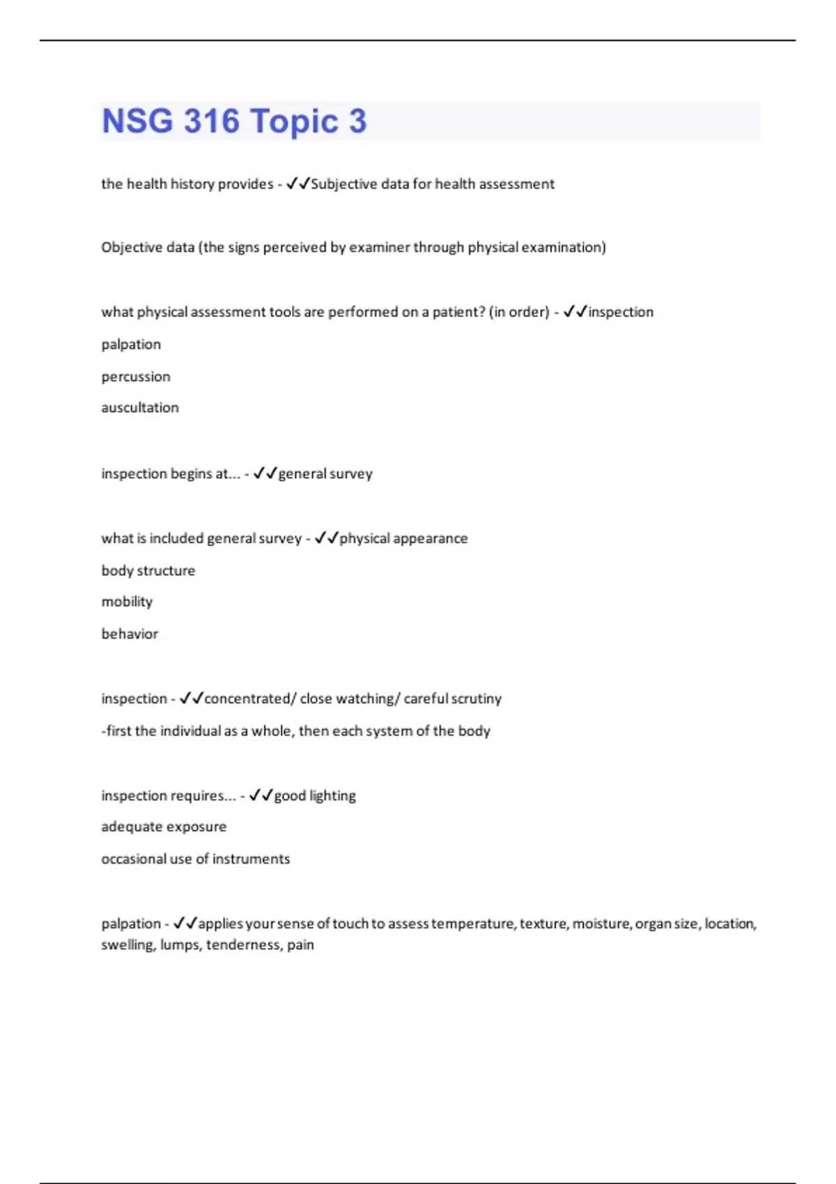 the health history provides - Subjective data for health assessment Objective data (the signs perceived by examiner through physical examination) what physical assessment tools are performed on a patient? (in order) - inspection palpation percussion auscultation inspection begins at... - general survey what is included general survey - physical appearance body structure mobility behavior inspection - concentrated/ close watching/ careful scrutiny -first the individual as a whole, then each system of the body inspection requires... - good lighting adequate exposure occasional use of instruments palpation - applies your sense of touch to assess temperature, texture, moisture, organ size, location, swelling, lumps, tenderness, painfingertips - best for fine tactile discrimination, as of skin texture, swelling, pulsation, and determining presence of lumps fingers and thumbs - detection of position, shape, and consistency of an organ or mass (grasping action) Dorsa (backs) of hands and fingers - best for determining temperature because skin here is thinner than on palms