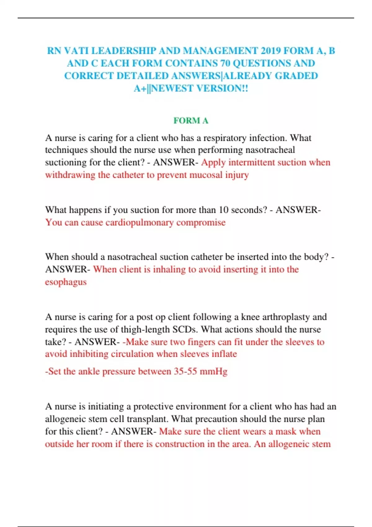 RN VATI LEADERSHIP AND MANAGEMENT 2019 FORM A, B AND C EACH FORM CONTAINS 70 QUESTIONS AND CORRECT DETAILED ANSWERS|ALREADY GRADED A+||NEWEST VERSION!!