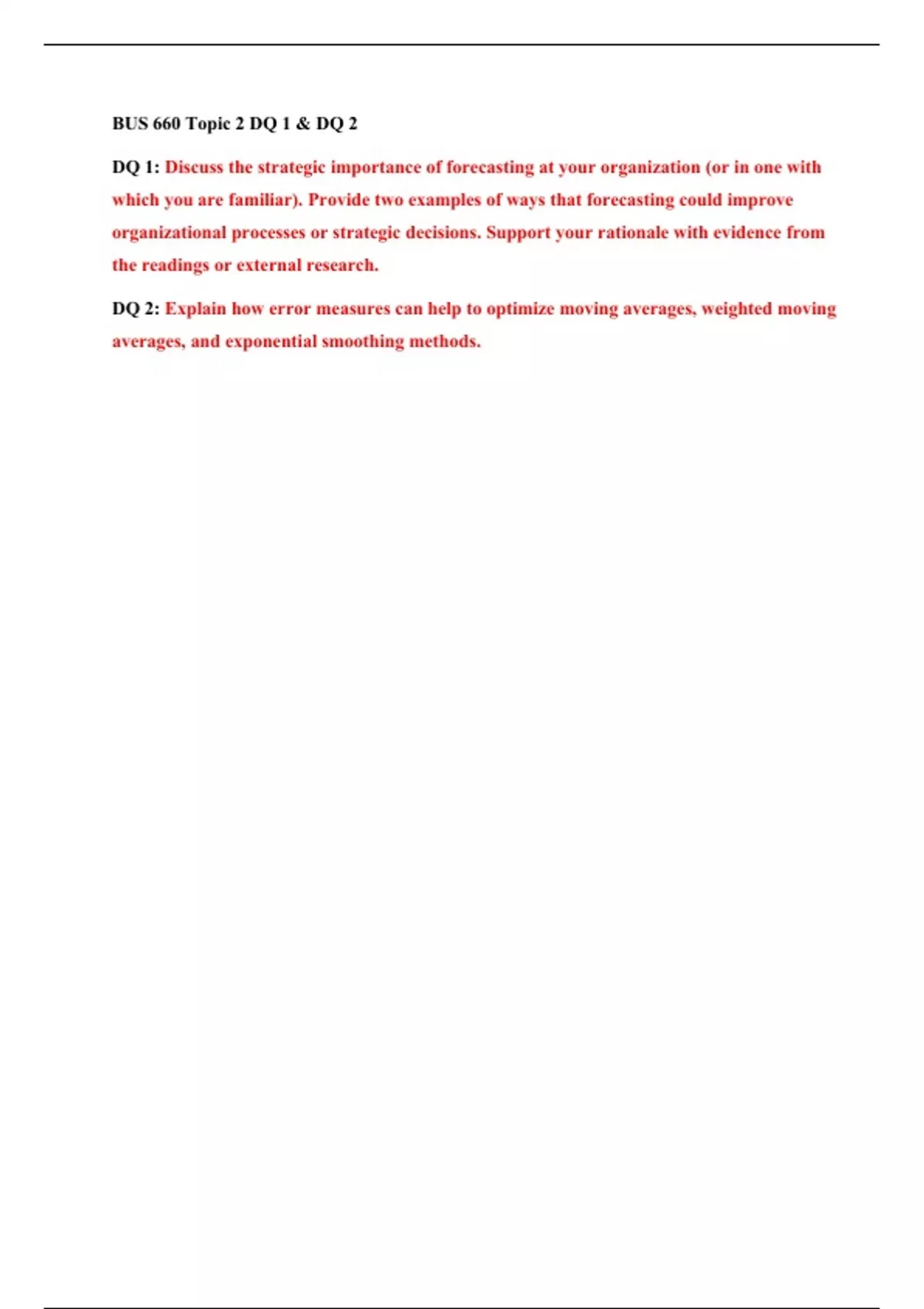 BUS 660Topic 2 DQ 1 & DQ 2 DQ 1: Discuss the strategic importance of forecasting at your organization (or in one with which you are familiar). Provide two examples of ways that forecasting could improve organizational processes or strategic decisions. Support your rationale with evidence from the readings or external research. DQ 2: Explain how error measures can help to optimize moving averages, weighted moving averages, and exponential smoothing methods.