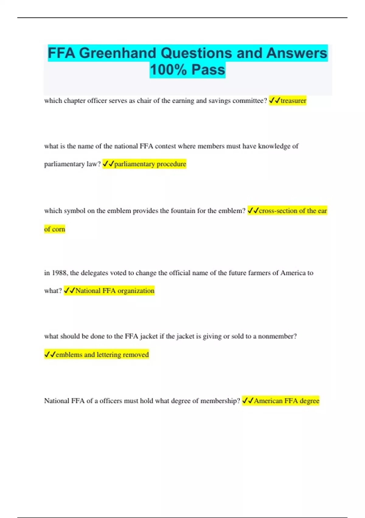 FFA Greenhand Questions and Answers 100% Pass which chapter officer serves as chair of the earning and savings committee? treasurer what is the name of the national FFA contest where members must have knowledge of parliamentary law? parliamentary procedure which symbol on the emblem provides the fountain for the emblem? cross-section of the ear of corn in 1988, the delegates voted to change the official name of the future farmers of America to what? National FFA organization what should be done to the FFA jacket if the jacket is giving or sold to a nonmember? emblems and lettering removed National FFA of a officers must hold what degree of membership? American FFA degree The daughters of America revolution manual should be consulted if specific questions arise concerning what? The flag amendments to the State FFA Constitution must be submitted to the state office on or before what date? February 2 three medals may be worn on the jacket should represent what? highest degree, highest office, highest award which chapter officer appoints all committees? President what is the name of the organization once established for African American agriculture students? New farmers of America Who is the second Oklahoma person to serve as national as of a president of the national FFA? Oliver Kinzie when are American FFA degree applications due the state office? May 15 Who is the state FFA Reporter? Hallie Barnes what is the hometown chapter of the current Oklahoma Central District Vice president? Edmond Who is the national executive secretary of FFA? Sherene Donaldson what do the letters P.0.A. stand for? program of activities what does the letters SAE stand for? supervised agricultural experience program how many official delegates in each state associations guaranteed to have at the national FFA convention? Two how many people make up the State FFA Executive Committee? Ten American FFA Degree recipients are entitled to wear what official emblem? Gold Key What is the official dress for male members? black slacks, white collared shirt, official ffa tie, black shoes, and official jacket Which officer is responsible for posting the agenda each meeting? Secretary Who was the first female National FFA president? Jan Eberly what year was the first national public speaking contest held? 1930 Who is the most recent president of the United States to attend the national FFA convention? Gerald ford (George Bush was vice president when he attended) what year was the BOAC program started? 1970 what was the first year the national FFA convention was held in Louisville, Kentucky? 1999 A chapter FFA degree recipient must have earned and productive we invested at least how many dollars in there SAE program? $150 State FFA degree recipient must have at least how many letters of recommendation? 3 State FFA degree recipients shall be entitled to wear what official medal? Gold emblem charm what do the letters WLC mean? Washington leadership conference The vice president is stationed by what symbol? The plow which officer should assist with special features and refreshments? Sentinel where did the national headquarters move to? Indianapolis, Indiana The FFA membership roster and dues are due in the state office on what date? November 15 in what year did delegates at the national FFA convention change the name to national FFA organization? 1988 what is the name of the national FFA contest where members must have knowledge of job interview skills and Customer relations? agricultural sales which officer states as a part of the opening ceremony, my duties require me to assist at all times and directing the work of our organization? Vice president which officer should represent the chapter in public relations an official functions? President which symbol on the emblem symbolizes the knowledge required to be successful in the industry of agriculture? Owl what is the name of the city and state where the national FFA center was located until 1998? Alexandria, Virginia National FFA foundation scholarship applications are due on what date? Feb. 15th