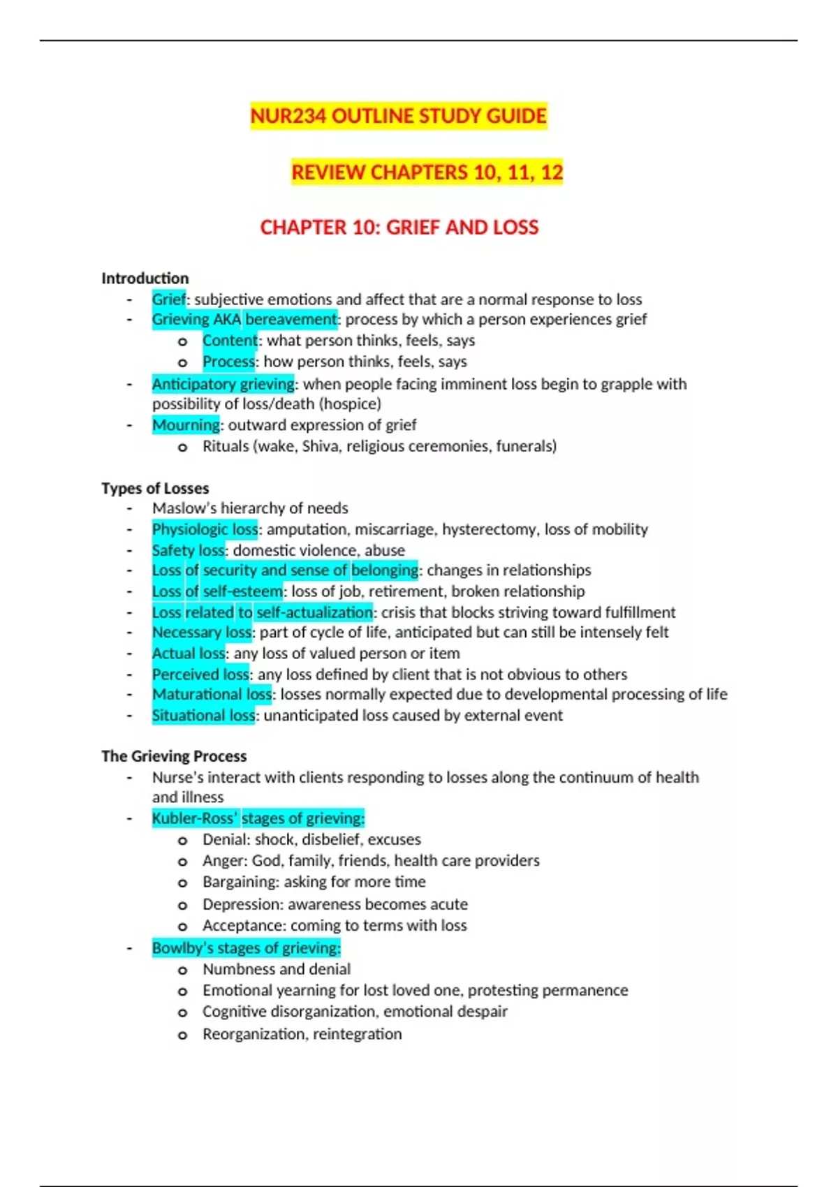 NUR234 OUTLINE STUDY GUIDE REVIEW CHAPTERS 10, 11, 12