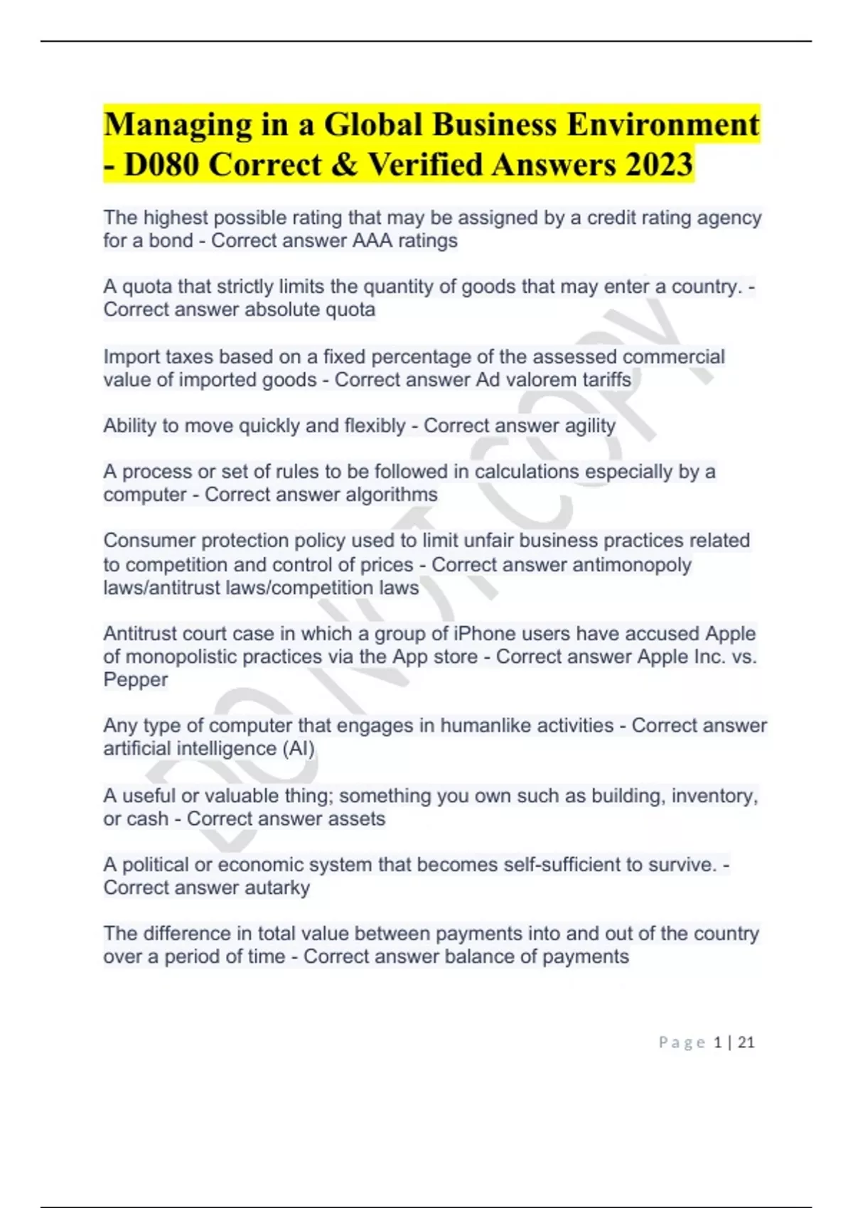 Managing in a Global Business Environment - D080 Correct & Verified Answers 2023Managing in a Global Business Environment - D080 Correct & Verified Answers 2023