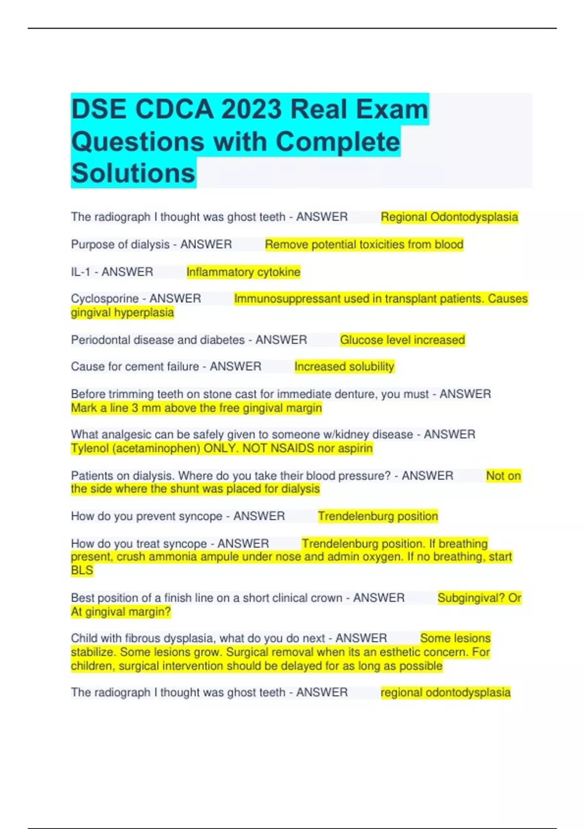 DSE CDCA 2023 Real Exam Questions with Complete Solutions The radiograph I thought was ghost teeth - ANSWER Regional Odontodysplasia Purpose of dialysis - ANSWER Remove potential toxicities from blood IL-1 - ANSWER Inflammatory cytokine Cyclosporine - ANSWER Immunosuppressant used in transplant patients. Causes gingival hyperplasia Periodontal disease and diabetes - ANSWER Glucose level increased Cause for cement failure - ANSWER Increased solubility Before trimming teeth on stone cast for immediate denture, you must - ANSWER Mark a line 3 mm above the free gingival margin What analgesic can be safely given to someone w/kidney disease - ANSWER Tylenol (acetaminophen) ONLY. NOT NSAIDS nor aspirin Patients on dialysis. Where do you take their blood pressure? - ANSWER Not on the side where the shunt was placed for dialysis How do you prevent syncope - ANSWER Trendelenburg position How do you treat syncope - ANSWER Trendelenburg position. If breathing present, crush ammonia ampule under nose and admin oxygen. If no breathing, start BLS Best position of a finish line on a short clinical crown - ANSWER Subgingival? Or At gingival margin? Child with fibrous dysplasia, what do you do next - ANSWER Some lesions stabilize. Some lesions grow. Surgical removal when its an esthetic concern. For children, surgical intervention should be delayed for as long as possible The radiograph I thought was ghost teeth - ANSWER regional odontodysplasia Purpose of dialysis - ANSWER Remove potential toxicities from blood IL-1 - ANSWER Inflammatory cytokine Cyclosporine - ANSWER Immunosuppressant used in transplant patients. Causes gingival hyperplasia
