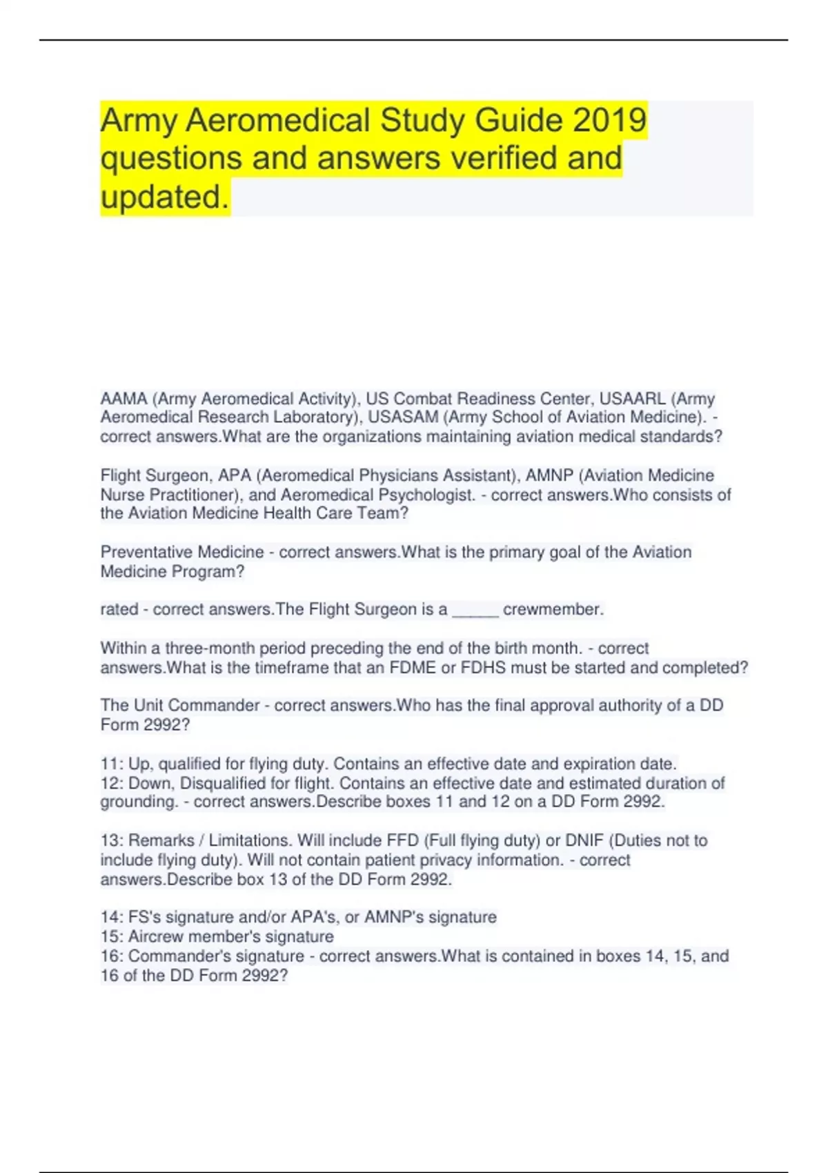 Army Aeromedical Study Guide 2019 questions and answers verified and updated. AAMA (Army Aeromedical Activity), US Combat Readiness Center, USAARL (Army Aeromedical Research Laboratory), USASAM (Army School of Aviation Medicine). - correct answers.What are the organizations maintaining aviation medical standards? Flight Surgeon, APA (Aeromedical Physicians Assistant), AMNP (Aviation Medicine Nurse Practitioner), and Aeromedical Psychologist. - correct answers.Who consists of the Aviation Medicine Health Care Team? Preventative Medicine - correct answers.What is the primary goal of the Aviation Medicine Program? rated - correct answers.The Flight Surgeon is a _____ crewmember. Within a three-month period preceding the end of the birth month. - correct answers.What is the timeframe that an FDME or FDHS must be started and completed? The Unit Commander - correct answers.Who has the final approval authority of a DD Form 2992? 11: Up, qualified for flying duty. Contains an effective date and expiration date. 12: Down, Disqualified for flight. Contains an effective date and estimated duration of grounding. - correct answers.Describe boxes 11 and 12 on a DD Form 2992. 13: Remarks / Limitations. Will include FFD (Full flying duty) or DNIF (Duties not to include flying duty). Will not contain patient privacy information. - correct answers.Describe box 13 of the DD Form 2992. 14: FS's signature and/or APA's, or AMNP's signature 15: Aircrew member's signature 16: Commander's signature - correct answers.What is contained in boxes 14, 15, and 16 of the DD Form 2992? Temporary results in requalification within 365 days. Permanent is not likely to result in requalification within 365 days. - correct answers.What is the difference of a temporary versus permanent medical disqualification? Initial (18 months) and comprehensive (5 years between 20-49 Yrs, 1 year at 50 yrs and older). - correct answers.What are the two types of FDME and how long are they valid for? Class 1 - Initial for those that want to be pilots. Class 2 - Aviators, FS, DAC Pilots, and APA/AMNP. Class 3 - Non-rated crewmembers and Aeromedical Psychologists. Class 4 - ATC and UAV operators. - correct answers.What are the classes of FDME and who are the performed for? Annually between each comprehensive FDME. - correct answers.How frequently must an FDHS be completed? Castor Oil - correct answers.What is the first fuel used in aviation? Hippocrates - correct answers.Who was the first to describe the relationship between work and illness? Physical, Chemical, Biological - correct answers.Name the 3 general types of toxic hazards encountered in an aviation environment. chemical - correct answers.Identify what toxic hazard: Water inhaled in large quantities and oxygen inhaled in a hyperbaric chamber? Acute and chronic - correct answers.What are two types of exposure? Anything capable of producing an adverse health effect (injury or illness). - correct answers.What is the definition of an occupational hazard? Inhalation, Skin (absorption), and ingestion. - correct answers.What are the three routes a toxin can enter the body? Aviation fuels Aviation combustion products Composites and plastics Solvents and degreasers Lubricants and hydraulic fluids Fire extinguishing materials - correct answers.What toxic substances could you be exposed to in an aviation environment? Lightheadedness