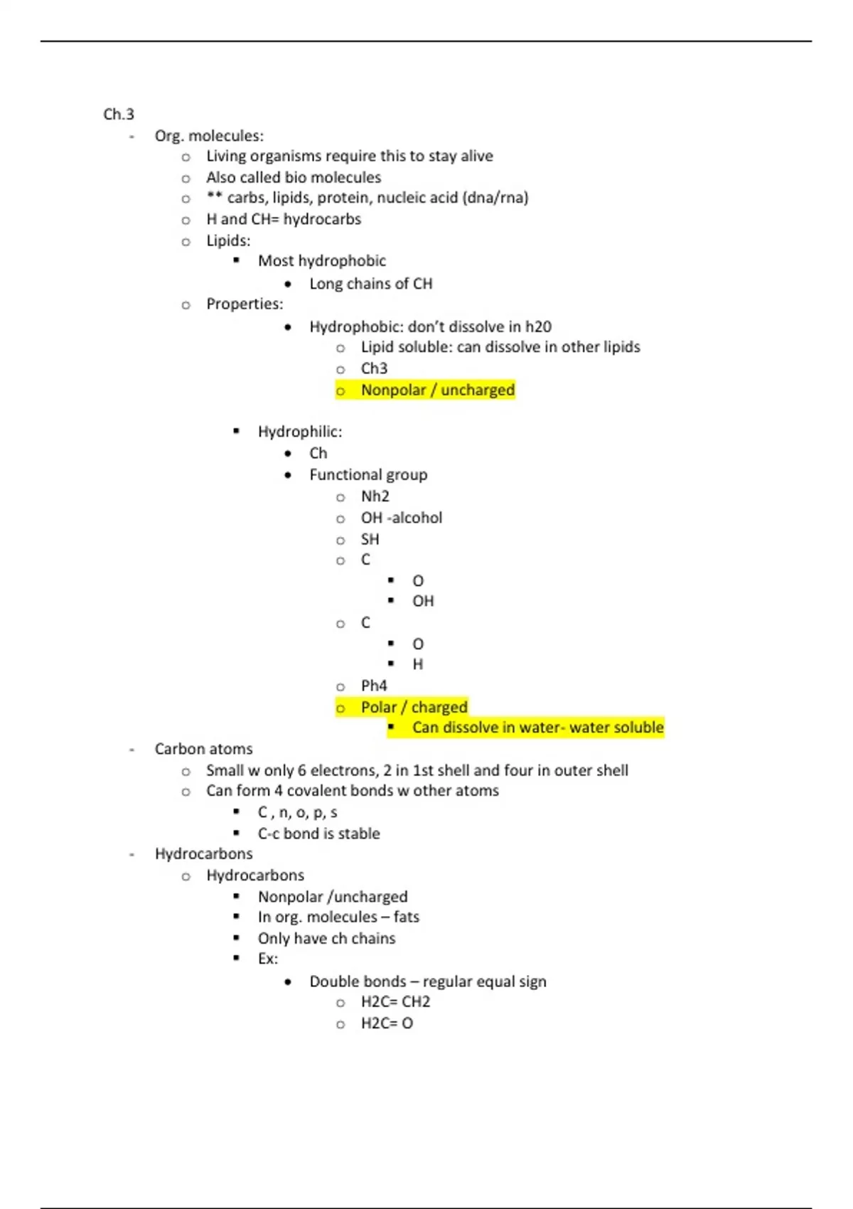 organic molecules, lipids, properties, hydrophilic, carbon atoms, hydrocarbons, functional groups, isomers, biomolecules
