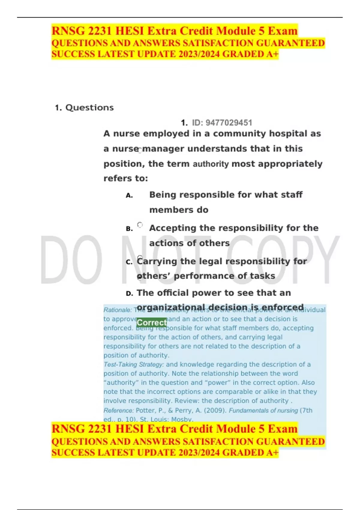 1. Questions 1. ID: 1 A nurse employed in a community hospital as a nurse manager understands that in this position, the term authority most appropriately refers to: A. Being responsible for what staff members do B. Accepting the responsibility for the actions of others C. Carrying the legal responsibility for others’ performance of tasks D. The official power to see that an organizational decision is enforced Correct Awarded 1.0 points out of 1.0 possible points. 2. 2.ID: 0 Which action by the nurse represents the ethical principle of beneficence? A. The nurse upholds a client’s decision to refuse chemotherapy for lung cancer. B. The nurse follows a plan of care designed to relieve pain in a client with cancer. C. The nurse administers an immunization to a child even though it may cause discomfort. Correct D. The nurse provides equal amounts of care to all assigned clients on the basis of illness acuity. Awarded 1.0 points out of 1.0 possible points. 3. 3.1.ID: 4 A nurse has delegated several nursing tasks to staff members. The nurse’s primary responsibility after delegation of the tasks is: A. Documenting completion of each task