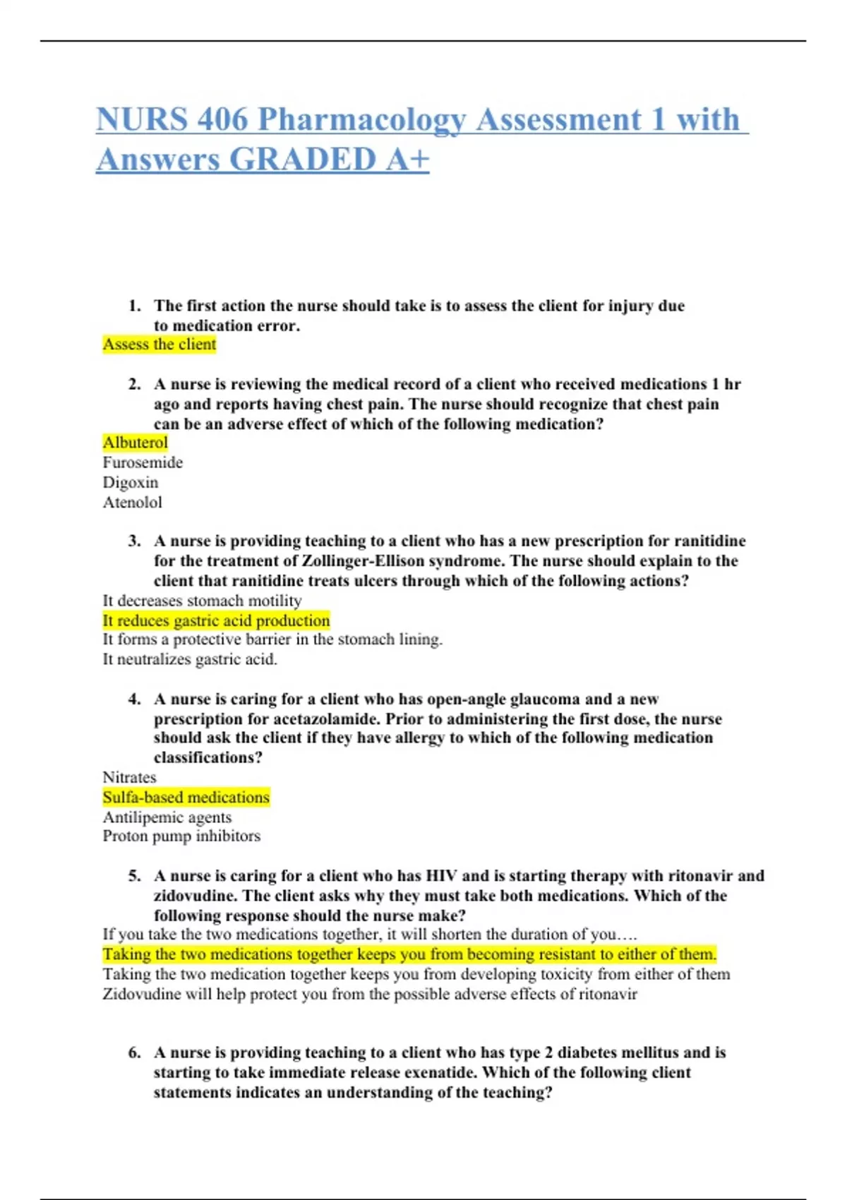 NURS 406 Pharmacology Assessment 1 with Answers GRADED A+ 1. The first action the nurse should take is to assess the client for injury due to medication error. Assess the client 2. A nurse is reviewing the medical record of a client who received medications 1 hr ago and reports having chest pain. The nurse should recognize that chest pain can be an adverse effect of which of the following medication? Albuterol Furosemide Digoxin Atenolol 3. A nurse is providing teaching to a client who has a new prescription for ranitidine for the treatment of Zollinger-Ellison syndrome. The nurse should explain to the client that ranitidine treats ulcers through which of the following actions? It decreases stomach motility It reduces gastric acid production It forms a protective barrier in the stomach lining. It neutralizes gastric acid. 4. A nurse is caring for a client who has open-angle glaucoma and a new prescription for acetazolamide. Prior to administering the first dose, the nurse should ask the client if they have allergy to which of the following medication classifications? Nitrates Sulfa-based medications Antilipemic agents Proton pump inhibitors 5. A nurse is caring for a client who has HIV and is starting therapy with ritonavir and zidovudine. The client asks why they must take both medications. Which of the following response should the nurse make? If you take the two medications together, it will shorten the duration of you…. Taking the two medications together keeps you from becoming resistant to either of them. Taking the two medication together keeps you from developing toxicity from either of them Zidovudine will help protect you from the possible adverse effects of ritonavir 6. A nurse is providing teaching to a client who has type 2 diabetes mellitus and is starting to take immediate release exenatide. Which of the following client statements indicates an understanding of the teaching? I will discard the open injector pen after two months I will inject the medication into the muscle of my thigh I will store open injector pens at room temperature I will take this medication one hour before morning and evening meals. 7. A nurse is providing teaching to a client who has a new prescription for folic acid. The client states I thought that was only given during pregnancy. Which of the following statements should the nurse make? Folic acid is important for stimulating the immune system Folic acid is given to increase the absorption of the medication Folic acid is administered to minimize the manifestations of benign prostatic hyperplasia Folic acid important for the building of blood cells. 8. A nurse in the PACU is caring for a client who has received general anesthesia and has manifestation of malignant hyperthermia. Which of the following medications should the nurse expect to administer? Diazepam Dantrolene Cyclobenzaprine Metaxalone 9. A nurse is caring for a client who refuses a prescribed influenza immunization. Which of the following actions should the nurse take first? Contact the provider who prescribed the immunization Ask the client to describe their concerns Provide the client with education about the immunization Document the client refusal of the immunization 10. A nurse is caring for a client who has a prescription for a hypotonic Iv fluid. Which of the following solution the nurse expects to administer? 0.45% sodium chloride 0.9% sodium chloride 3% sodium chloride Lactated ringers 11. A nurse in an emergency department is caring for a client who has a new prescription for acetylcysteine. For which of the following condition should the nurse expect to administer this medication? Gastrointestinal bleed Acute bronchospasm Morphine toxicity Acetaminophen toxicity 12. A nurse is obtaining vital signs for a client who has been taking propranolol. Which of the following finding should the nurse identify as an adverse effect of the medication? Respiratory rate 20/min Oral temperature 37.8 Blood pressure 118/78 mm Apical pulse 50 /min 13. A nurse is providing teaching to a client who has neuropathic pain and a new prescription for amitriptyline once per day. Which of the following information should the nurse include in the teaching? Increase fluids while taking the medication Expect an elevation in blood pressure with initial doses of the medication Stop the medication immediately if urine becomes orange in color Take the medication in the morning 14. A nurse is providing teaching to a client who has a new prescription for oral extended-release potassium chloride tablets. Which of the following instructions should the nurse include in the teaching? Do not crush this medication Dissolve the tablet in your mouth Take this medication on an empty stomach Take this medication every other day 15. A nurse is providing teaching to a client who has a new prescription for levothyroxine. Which of the following statements by the client indications an understanding of the teaching? I should take this medication with food I will take three doses each day I might not realize the full effect of the medication for several weeks I might gain weight while taking this medication if I do not exercise 16. While assessing a client at the beginning of the shift a nurse notes that the client received a medication in error from the nurse on the previous shift. At which of the following times should the nurse plan to complete an incident report about the error? After the end of the current shift After contacting risk management As soon as the assessment is complete As soon as the nurse from the previous shift has been informed 17. A nurse is preparing to administer a second unit of packed RBCs to a client who is experiencing hemorrhagic shock. The nurse should monitor the client for which of the following manifestation as an indication of circulatory overload? Chills Wheezing Dyspnea Flushing 18. A nurse is planning care for a client who has neutropenia. Which of the following medication should the nurse e