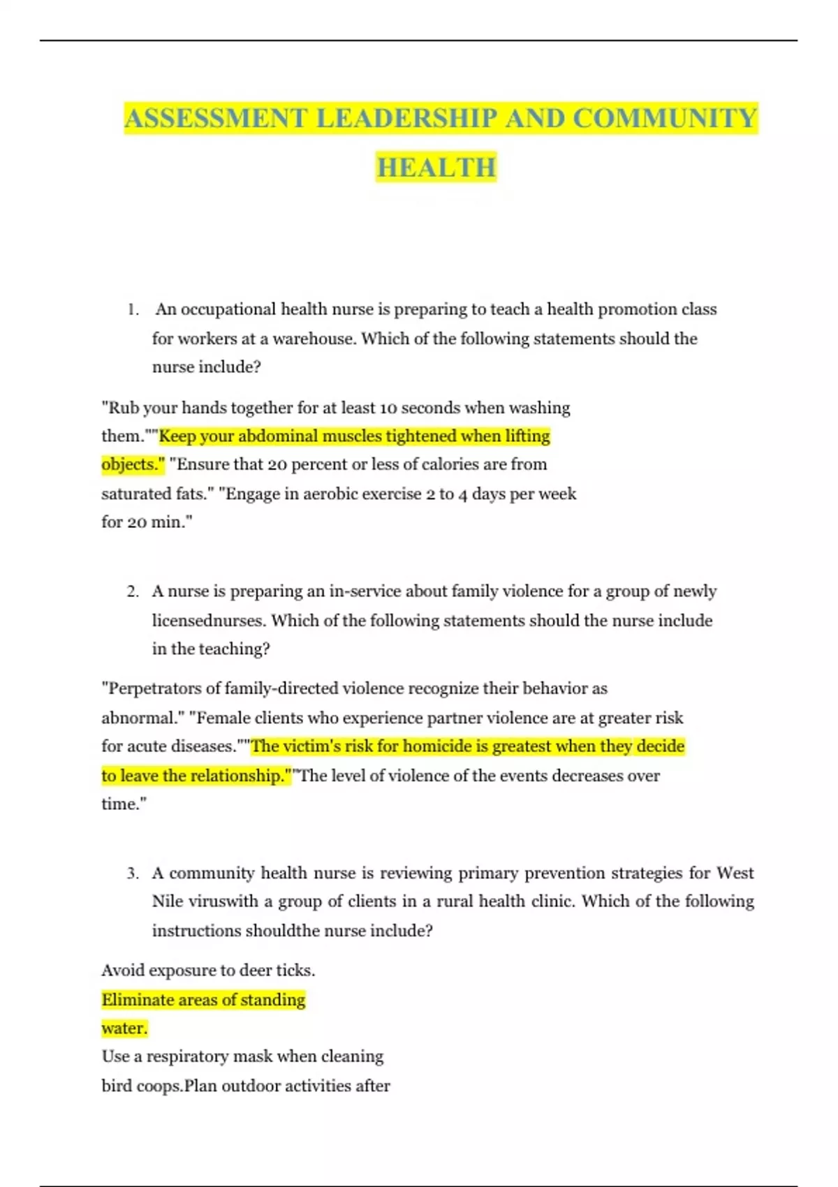 ASSESSMENT LEADERSHIP AND COMMUNITY HEALTH 1. An occupational health nurse is preparing to teach a health promotion class for workers at a warehouse. Which of the following statements should the nurse include? "Rub your hands together for at least 10 seconds when washing them.""Keep your abdominal muscles tightened when lifting objects." "Ensure that 20 percent or less of calories are from saturated fats." "Engage in aerobic exercise 2 to 4 days per week for 20 min." 2. A nurse is preparing an in-service about family violence for a group of newly licensednurses. Which of the following statements should the nurse include in the teaching? "Perpetrators of family-directed violence recognize their behavior as abnormal." "Female clients who experience partner violence are at greater risk for acute diseases.""The victim's risk for homicide is greatest when they decide to leave the relationship.""The level of violence of the events decreases over time." 3. A community health nurse is reviewing primary prevention strategies for West Nile viruswith a group of clients in a rural health clinic. Which of the following instructions shouldthe nurse include? Avoid exposure to deer ticks. Eliminate areas of standing water. Use a respiratory mask when cleaning bird coops.Plan outdoor activities after dusk 4. A school nurse is providing care for students in an elementary education facility. Whichof the following interventions by the nurse addresses the primary level of prevention? Design interventions for a student's individual education plan (IEP).Teach students about healthy food choices. Perform first aid for minor injuries. Perform scoliosis screenings for students. 5. A nurse is conducting a home visit with an older adult client. Which of the followingobservations should the nurse address to promote a safe environment? Loud volume of the television set Wall-to-wall carpet in the living roomLow chairs without armrests Use of indirect lighting 6. A case manager completes a history and physical assessment for a client who has COPD.Which of the following actions should the case manager take next? Identify the client's current health needs. Call the provider with a list of client concerns. Compile a list of community resources for the client.Refer the client to a COPD support group 7. A nurse manager is implementing a quality improvement project to reduce the number ofmethicillinresistant Staphylococcus aureus (MRSA) infections at the facility. Which of the following actions should the nurse manager take first? Develop a MRSA protocol for implementation.Provide educational in- service for staff. Evaluate outcomes resulting from interventions. Conduct a chart review to evaluate precipitating factors of clients who develop MRSA. 8. A nurse manager is teaching a group of employees about standards for Quality and SafetyEducation for Nurses (QSEN). Which of the following statements by an employee shouldthe nurse manager identify as an example of the QSEN concept of quality improvement? "We should start tracking how soon clients are discharged after laparoscopic versus opensurgery." "We should be sure to log out of the computers immediately following documentation.""We should involve our clients' partners in care planning as much as possible." "We should provide change-of-shift report as a team, including the assistive personnel whoassisted with care. 9. A hospice nurse is providing teaching to a client who has a new diagnosis of a terminal illness and her family. Which of the following statements should the nurse include in theteaching? "Hospice care focuses on disease treatment and rehabilitation." "The provider will coordinate your health care needs while in hospice." "You must choose a family caregiver before being admitted into a hospice facility.""Hospice care continues to help families with grief after a death occurs." 10. A nurse manager is discussing electronic medical records with a newly licensed nurse. Which of the following actions should the nurse take to maintain client confidentiality?(Select all that apply.) Log out of the computer terminal before leaving. Share passwords for computer access with colleagues.Change computer access passwords on a regular basis. Avoid accessing information about clients admitted to other units.Shred computer-generated client worksheets after use. 11. A nurse is completing an assessment of a recently widowed older adult client. He stateshe is unable to drive and is afraid to cook on the stove. Which of the following community resources should the nurse re