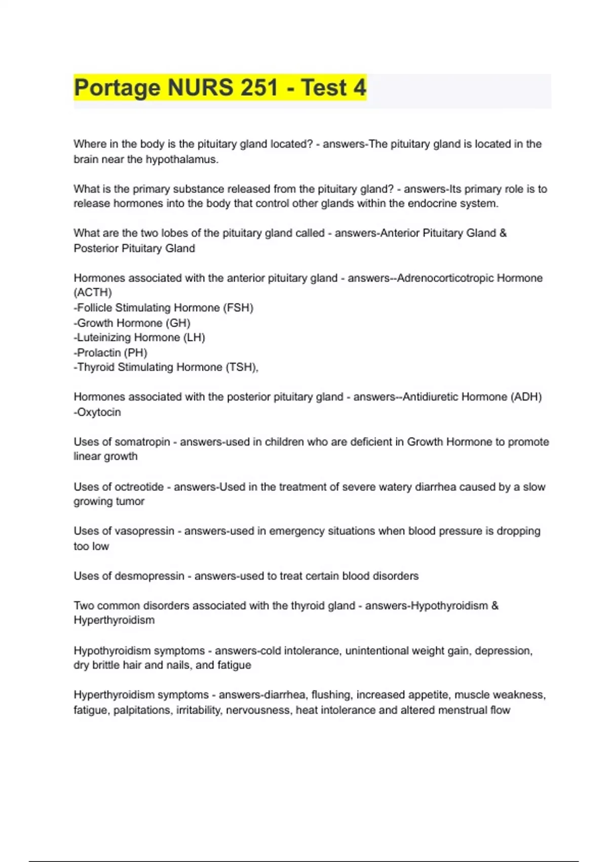 Portage NURS 251 - Test 4/full solution/verified 100% correct answers 2023 Where in the body is the pituitary gland located? - answers-The pituitary gland is located in the brain near the hypothalamus. What is the primary substance released from the pituitary gland? - answers-Its primary role is to release hormones into the body that control other glands within the endocrine system. What are the two lobes of the pituitary gland called - answers-Anterior Pituitary Gland & Posterior Pituitary Gland