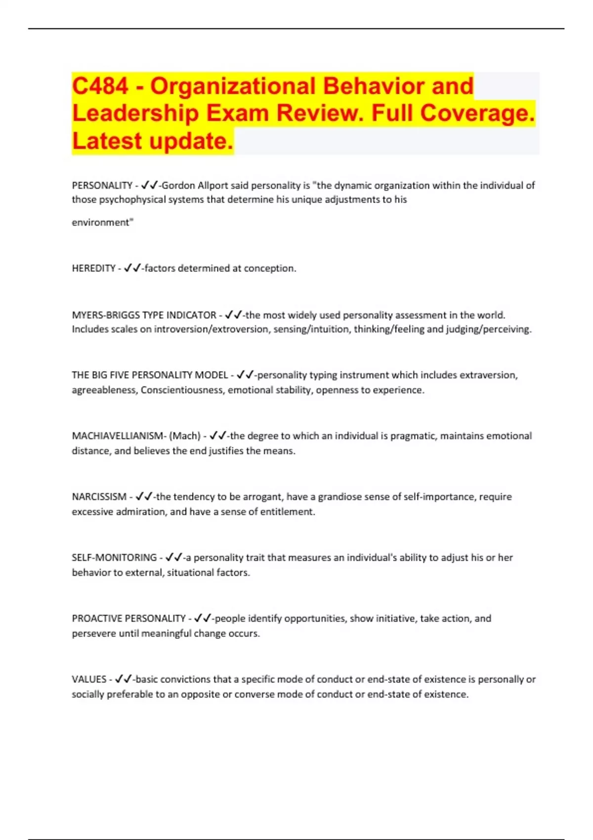 C484 - Organizational Behavior and Leadership Exam Review. Full Coverage. Latest update.