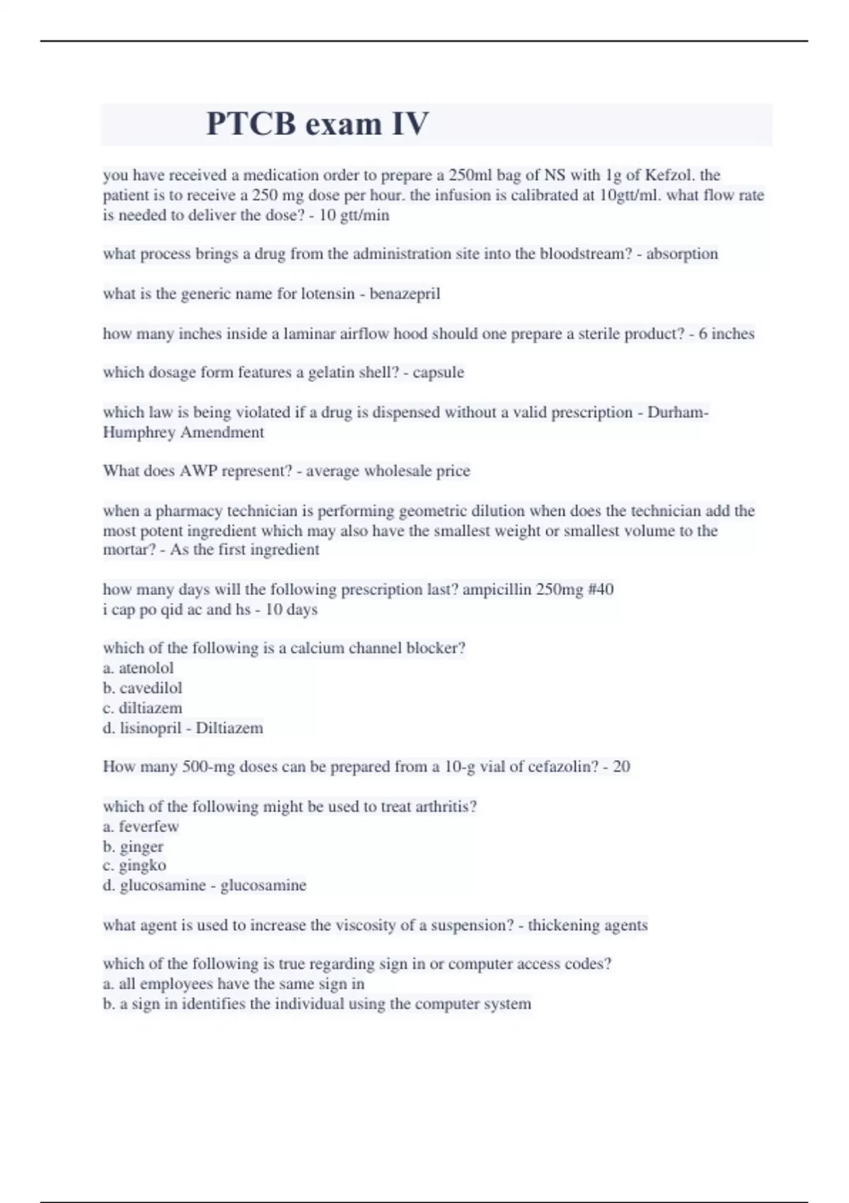 PTCB exam IV you have received a medication order to prepare a 250ml bag of NS with 1g of Kefzol. the patient is to receive a 250 mg dose per hour. the infusion is calibrated at 10gtt/ml. what flow rate is needed to deliver the dose? - 10 gtt/min what process brings a drug from the administration site into the bloodstream? - absorption what is the generic name for lotensin - benazepril how many inches inside a laminar airflow hood should one prepare a sterile product? - 6 inches which dosage form features a gelatin shell? - capsule which law is being violated if a drug is dispensed without a valid prescription - Durham-Humphrey Amendment What does AWP represent? - average wholesale price when a pharmacy technician is performing geometric dilution when does the technician add the most potent ingredient which may also have the smallest weight or smallest volume to the mortar? - As the first ingredient how many days will the following prescription last? ampicillin 250mg #40 i cap po qid ac and hs - 10 days which of the following is a calcium channel blocker? a. atenolol b. cavedilol c. diltiazem d. lisinopril - Diltiazem How many 500-mg doses can be prepared from a 10-g vial of cefazolin? - 20 which of the following might be used to treat arthritis? a. feverfew b. ginger c. gingko d. glucosamine - glucosamine what agent is used to increase the viscosity of a suspension? - thickening agents which of the following is true regarding sign in or computer access codes? a. all employees have the same sign in b. a sign in identifies the individual using the computer system c. all pharmacists and pharmacy techs have the same level of security d. the state board of pharmacy assigns sign in codes to all certified pharmacy techs - a sign in identifies the individual using the computer system what is the generic name for fosamax? - alendronate which therapeutic equivalence codes states that the product meets the necessary bioequivalence requirements? - aa what is an example of a health maintenance organization ( h m o) - Kaiser permanente which of the following would not be a reason an prescription is denied by an insurance company? a. compounded drugs with one ingredient being a legend drug b. wrong NDC number c. invalid id number d. prescription coverage has expired - compounded drugs with one ingredient being a legend drug what is the generic name for zyprexa - olanzapine how many grams of boric acid are required to make 4 fl oz of the following boric acid solution? Boric acid 51 g purified water qs to make 1000ml - 6g what type of label is placed on medications to warn patients or provide additional information? - auxiliary label which of the following is not an input device for a computer? a. bar code technology b. keyboard c. printer d. touch screen applications - printer what drug is abbreviated HCTZ? - hydrochlorothiazide which of the following does not need to be packaged in a child resistant package? - nitroglycerin which of the following is not used to treat hyperlipidemia? a. aspirin b. fibric acid derivatives c. HMG-CoA reductase inhibitors d. Metamucil - aspirin who is the member or recipient in managed care organizations? - subscriber which drug classification should be taken with caution if the pt is allergic to PCN? - cephalosporins what is the sensitivity of a class A balance? - 6 mg what is the percent equivalent of a 1:20 ration? - 5% what does u&C mean when billing prescriptions? - usual, customary PAR - the quantity of a product in stock when it reaches a certain point Gentamicin 120 mg in 100 mL D5W is administered over 30 minutes every 8 hours with a 10 drop kit. What will the gtt/min be? - 33 gtt/min what type of inventory is performed on controlled substances - Biennial inventory which of the following is considered a solid dosage form?