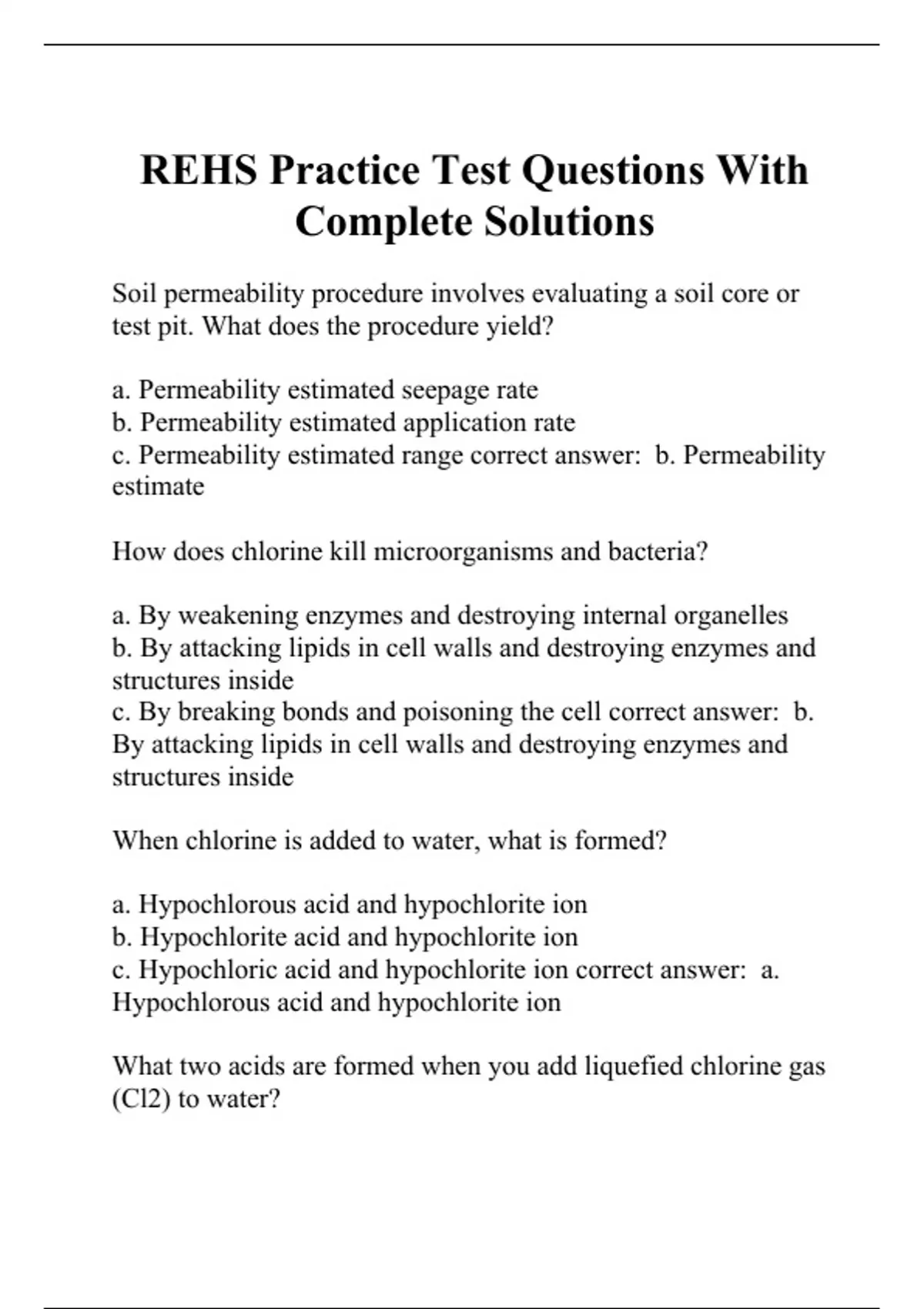 Soil permeability procedure involves evaluating a soil core or test pit. What does the procedure yield? a. Permeability estimated seepage rate b. Permeability estimated application rate c. Permeability estimated range correct answer: b. Permeability estimate How does chlorine kill microorganisms and bacteria? a. By weakening enzymes and destroying internal organelles b. By attacking lipids in cell walls and destroying enzymes and structures inside c. By breaking bonds and poisoning the cell correct answer: b. By attacking lipids in cell walls and destroying enzymes and structures inside When chlorine is added to water, what is formed? a. Hypochlorous acid and hypochlorite ion b. Hypochlorite acid and hypochlorite ion c. Hypochloric acid and hypochlorite ion correct answer: a. Hypochlorous acid and hypochlorite ion What two acids are formed when you add liquefied chlorine gas (Cl2) to water? a. Hypochlorite acid and hydrochloric acid b. Hypochlorous acid and hydrochloric acid c. Hypochloric acid and hydrochloric acid correct answer: b. Hypochlorous acid (HOCL) and hydrochloric acid (HCl) What cause pH to jump? a. Low alkalinity, precipitation, algae growth b. High alkalinity, precipitation, algae growth c. Low alkalinity, high calcium hardness, algae growth correct answer: a. Low alkalinity, precipitation, algae growth What do you add to lower pH? a. Sodium bisulphate (NaHSO4) b. HCl c. aerate with CO2 d. all of the above correct answer: d. all of the above What do you add to raise pH? a. Sodium carbonate (Na2CO3) (Soda Ash) b. Sodium bicarbonate c. Sodium bisulphate correct answer: a. Sodium carbonate (Na2CO3) (Soda Ash) Why do you use algaecides in pool even though chlorine is used? a. Chlorine is not effective against algae b. Chlorine levels required to kill aglae are dangerously high c. Insurance against sloppy chlorination correct answer: c. Insurance against sloppy chlorination Ozone (O3) is ______ faster than chlorine: a. 1500X b. 2000X