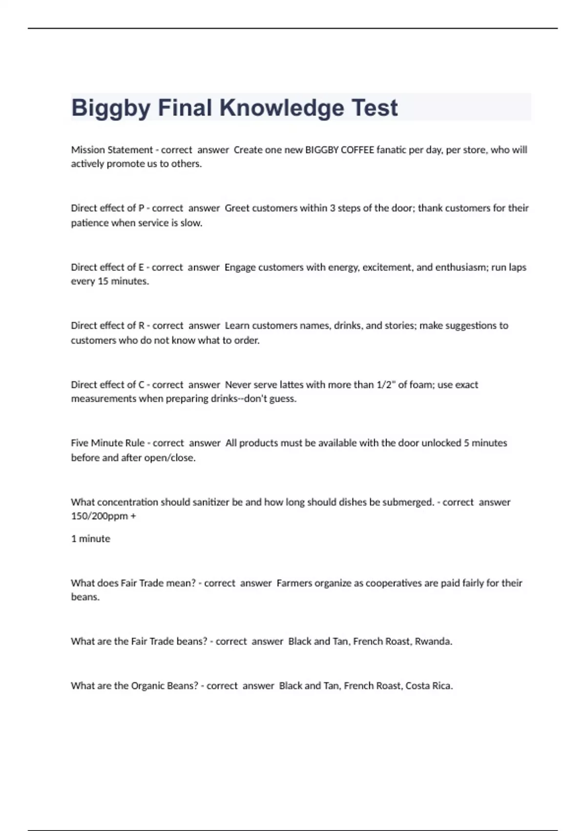 Biggby Final Knowledge Test exam questions and 100% correct answers