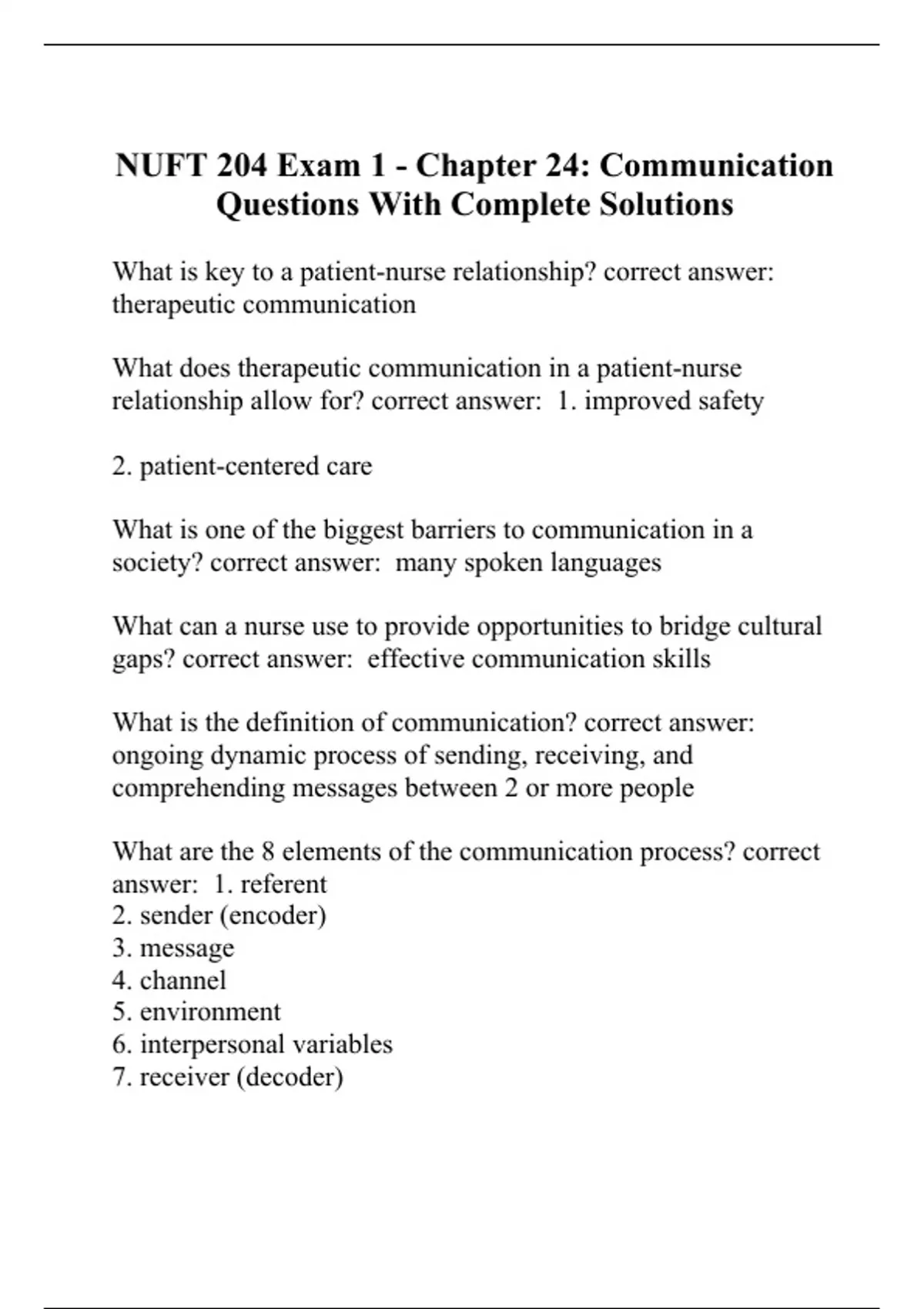What is key to a patient-nurse relationship? correct answer: therapeutic communication What does therapeutic communication in a patient-nurse relationship allow for? correct answer: 1. improved safety 2. patient-centered care What is one of the biggest barriers to communication in a society? correct answer: many spoken languages What can a nurse use to provide opportunities to bridge cultural gaps? correct answer: effective communication skills What is the definition of communication? correct answer: ongoing dynamic process of sending, receiving, and comprehending messages between 2 or more people What are the 8 elements of the communication process? correct answer: 1. referent 2. sender (encoder) 3. message 4. channel 5. environment 6. interpersonal variables 7. receiver (decoder) 8. feedback What is the definition of referent? Give examples of referents. correct answer: the motivation for communication examples: sights, sounds, perceptions, ideas What is the definition of sender (encoder)? correct answer: the person who initiates, encodes, and transmits the message What is the definition of message? correct answer: the content