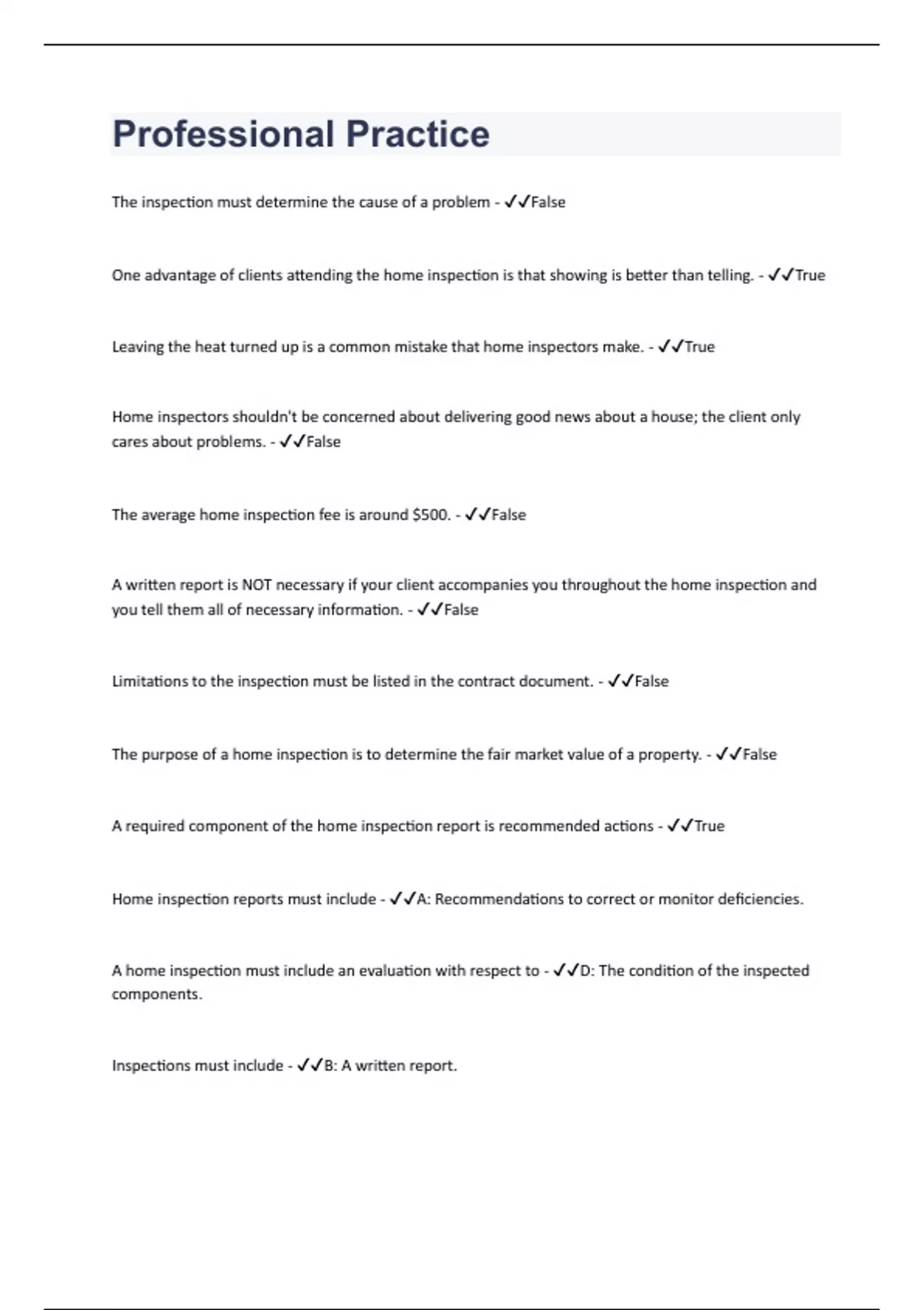 The inspection must determine the cause of a problem - False One advantage of clients attending the home inspection is that showing is better than telling. - True Leaving the heat turned up is a common mistake that home inspectors make. - True Home inspectors shouldn't be concerned about delivering good news about a house; the client only cares about problems. - False The average home inspection fee is around $500. - False A written report is NOT necessary if your client accompanies you throughout the home inspection and you tell them all of necessary information. - False Limitations to the inspection must be listed in the contract document. - False The purpose of a home inspection is to determine the fair market value of a property. - False A required component of the home inspection report is recommended actions - True Home inspection reports must include - A: Recommendations to correct or monitor deficiencies. A home inspection must include an evaluation with respect to - D: The condition of the inspected components. Inspections must include - B: A written report.