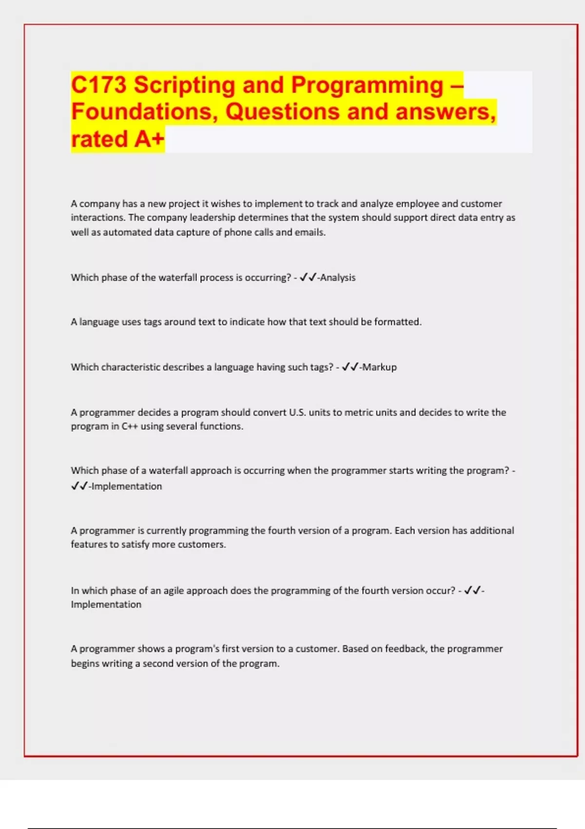 C173 Scripting and Programming – Foundations, Questions and answers, rated A+ A company has a new project it wishes to implement to track and analyze employee and customer interactions. The company leadership determines that the system should support direct data entry as well as automated data capture of phone calls and emails. Which phase of the waterfall process is occurring? - -Analysis A language uses tags around text to indicate how that text should be formatted. Which characteristic describes a language having such tags? - -Markup A programmer decides a program should convert U.S. units to metric units and decides to write the program in C++ using several functions. Which phase of a waterfall approach is occurring when the programmer starts writing the program? - -Implementation A programmer is currently programming the fourth version of a program. Each version has additional features to satisfy more customers. In which phase of an agile approach does the programming of the fourth version occur? - -Implementation A programmer shows a program's first version to a customer. Based on feedback, the programmer begins writing a second version of the program.