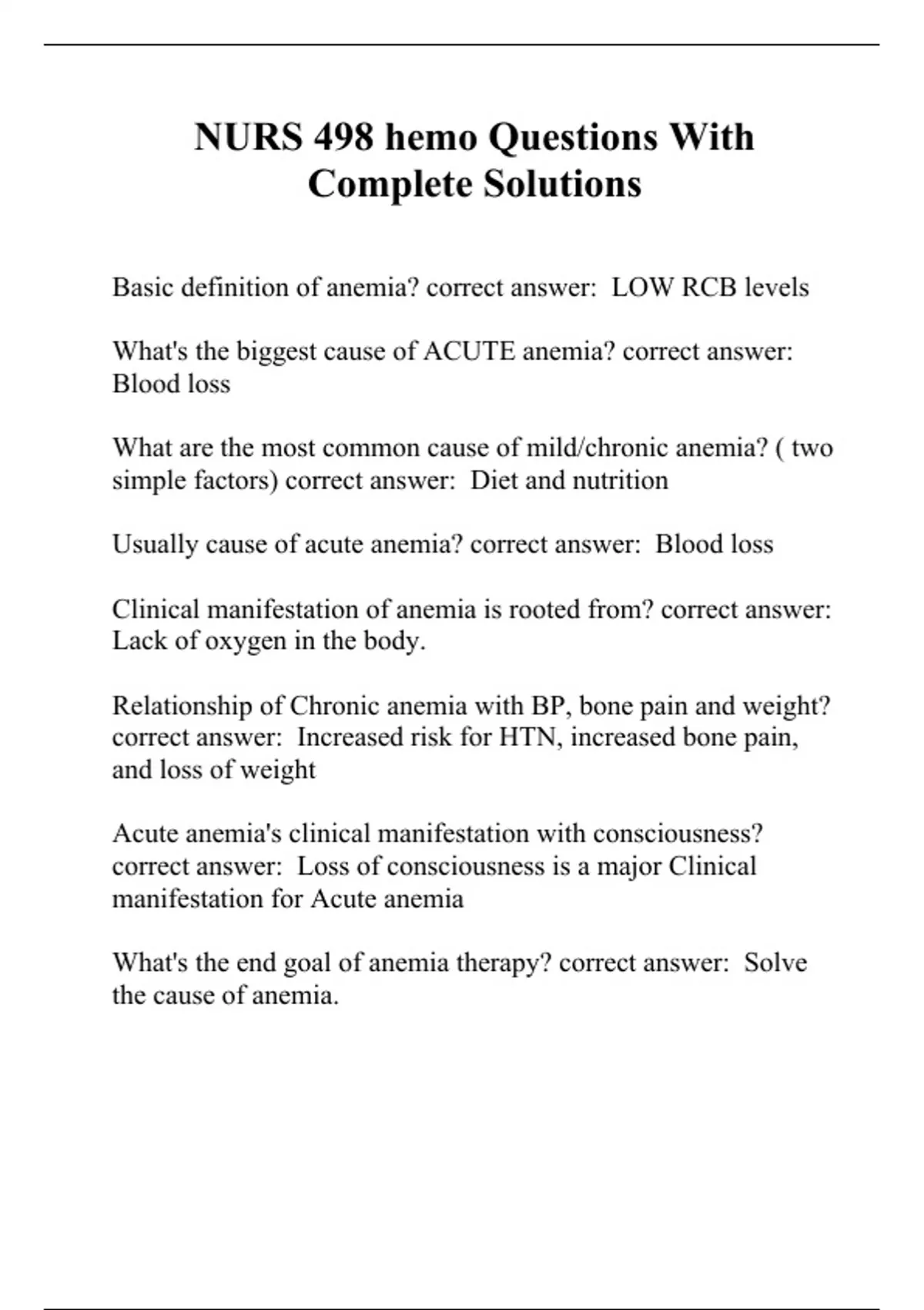 Basic definition of anemia? correct answer: LOW RCB levels What's the biggest cause of ACUTE anemia? correct answer: Blood loss What are the most common cause of mild/chronic anemia? ( two simple factors) correct answer: Diet and nutrition Usually cause of acute anemia? correct answer: Blood loss Clinical manifestation of anemia is rooted from? correct answer: Lack of oxygen in the body. Relationship of Chronic anemia with BP, bone pain and weight? correct answer: Increased risk for HTN, increased bone pain, and loss of weight Acute anemia's clinical manifestation with consciousness? correct answer: Loss of consciousness is a major Clinical manifestation for Acute anemia What's the end goal of anemia therapy? correct answer: Solve the cause of anemia. RBC supplementation, Saline infusion, vasopressor, increased oxygen are intervention for chronic or acute anemia? correct answer: Acute why do we give O2 supplementation for people with acute anemia? correct answer: People suffering from blood loss are typically low in oxygenated blood (hypoxemic) Diet and lifestyle changes are interventions for acu