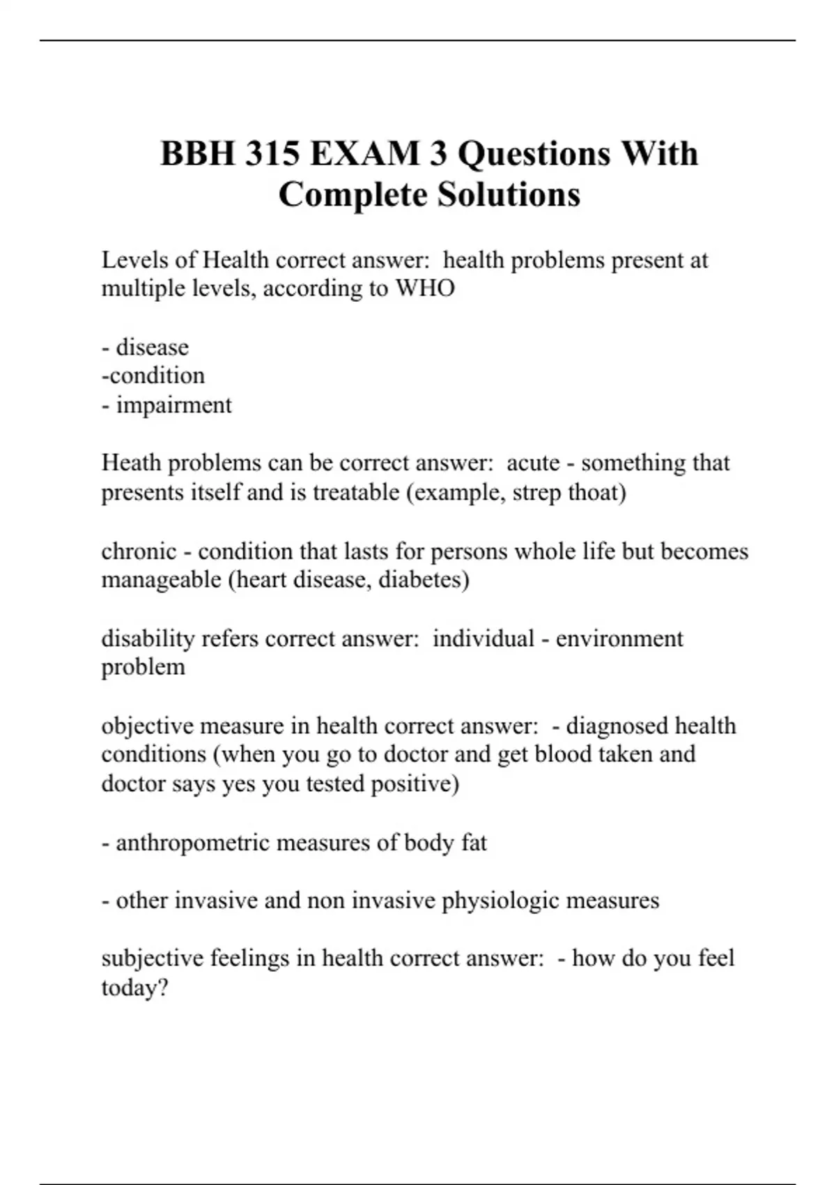 Levels of Health correct answer: health problems present at multiple levels, according to WHO - disease -condition - impairment Heath problems can be correct answer: acute - something that presents itself and is treatable (example, strep thoat) chronic - condition that lasts for persons whole life but becomes manageable (heart disease, diabetes) disability refers correct answer: individual - environment problem objective measure in health correct answer: - diagnosed health conditions (when you go to doctor and get blood taken and doctor says yes you tested positive) - anthropometric measures of body fat - other invasive and non invasive physiologic measures subjective feelings in health correct answer: - how do you feel today? - how do you feel compared to 2 years ago? - How would you rate your health compared to you age peers?