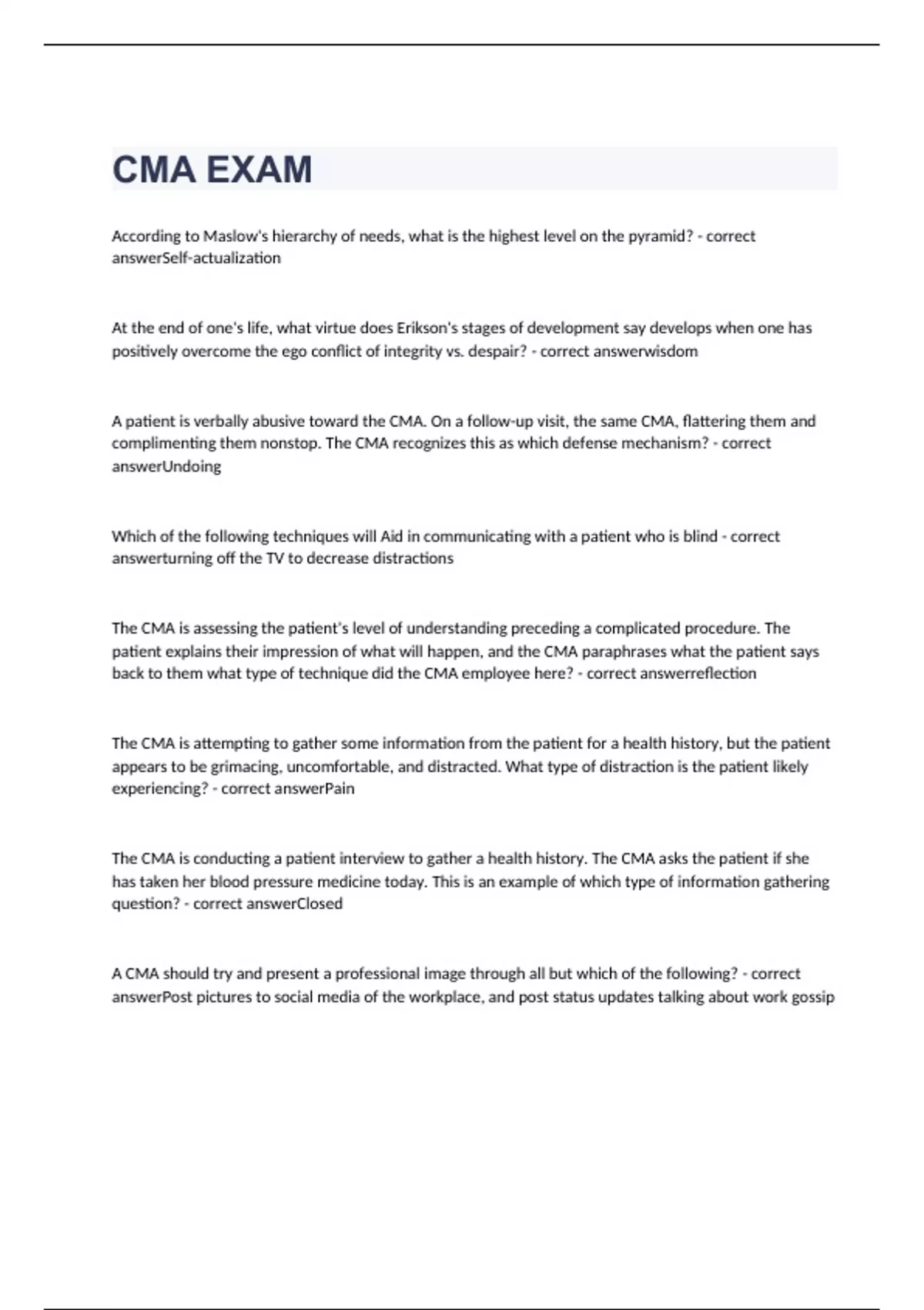 According to Maslow's hierarchy of needs, what is the highest level on the pyramid? - correct answerSelf-actualization At the end of one's life, what virtue does Erikson's stages of development say develops when one has positively overcome the ego conflict of integrity vs. despair? - correct answerwisdom A patient is verbally abusive toward the CMA. On a follow-up visit, the same CMA, flattering them and complimenting them nonstop. The CMA recognizes this as which defense mechanism? - correct answerUndoing Which of the following techniques will Aid in communicating with a patient who is blind - correct answerturning off the TV to decrease distractions The CMA is assessing the patient's level of understanding preceding a complicated procedure. The patient explains their impression of what will happen, and the CMA paraphrases what the patient says back to them what type of technique did the CMA employee here? - correct answerreflection The CMA is attempting to gather some information from the patient for a health history, but the patient appears to be grimacing, uncomfortable, and distracted. What type of distraction is the patient likely experiencing? - correct answerPain The CMA is conducting a patient interview to gather a health history. The CMA asks the patient if she has taken her blood pressure medicine today. This is an example of which type of information gathering question? - correct answerClosed A CMA should try and present a professional image through all but which of the following? - correct answerPost pictures to social media of the workplace, and post status updates talking about work gossip