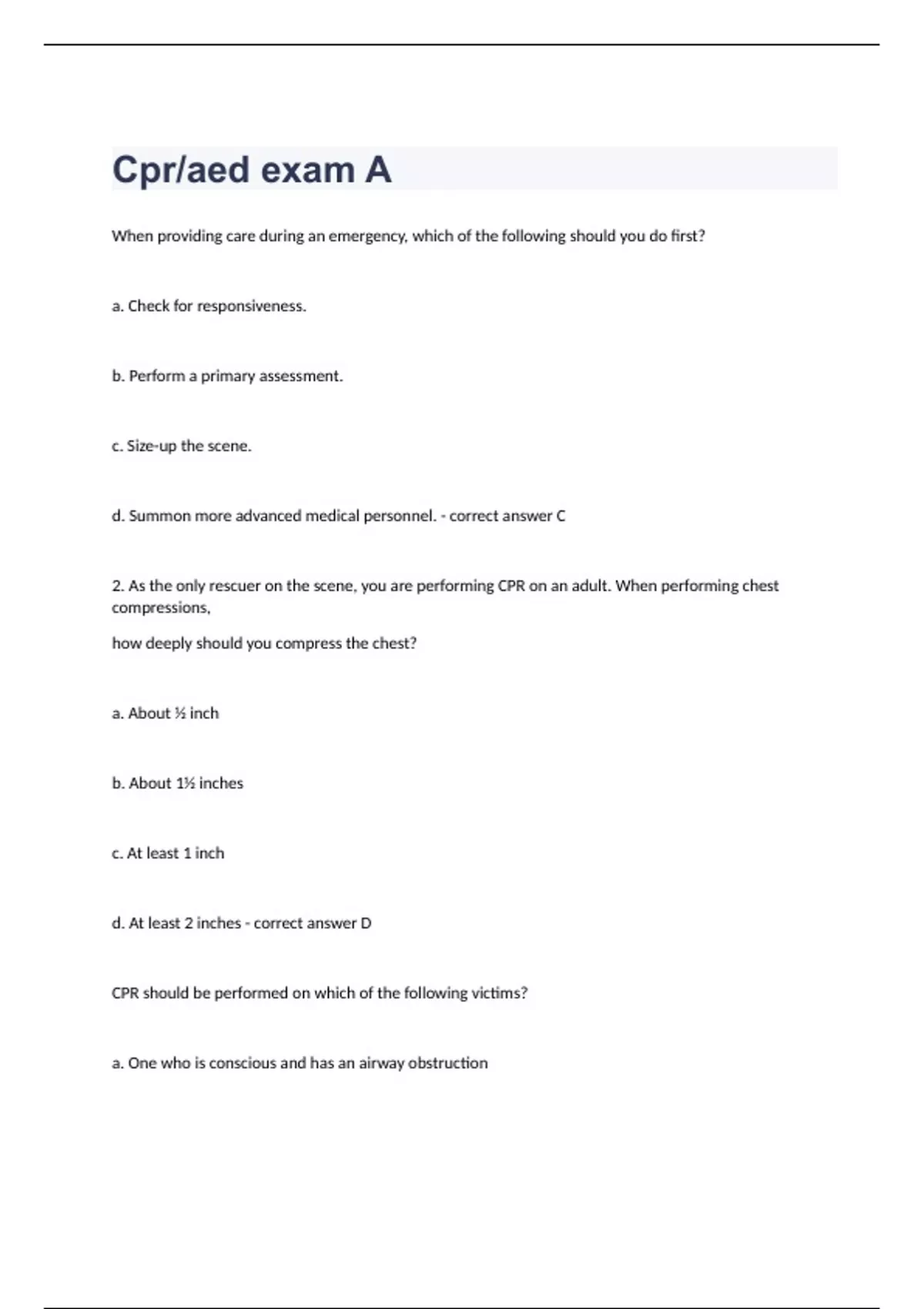 When providing care during an emergency, which of the following should you do first? a. Check for responsiveness. b. Perform a primary assessment. c. Size-up the scene. d. Summon more advanced medical personnel. - correct answer C 2. As the only rescuer on the scene, you are performing CPR on an adult. When performing chest compressions, how deeply should you compress the chest? a. About ½ inch b. About 1½ inches c. At least 1 inch d. At least 2 inches - correct answer D