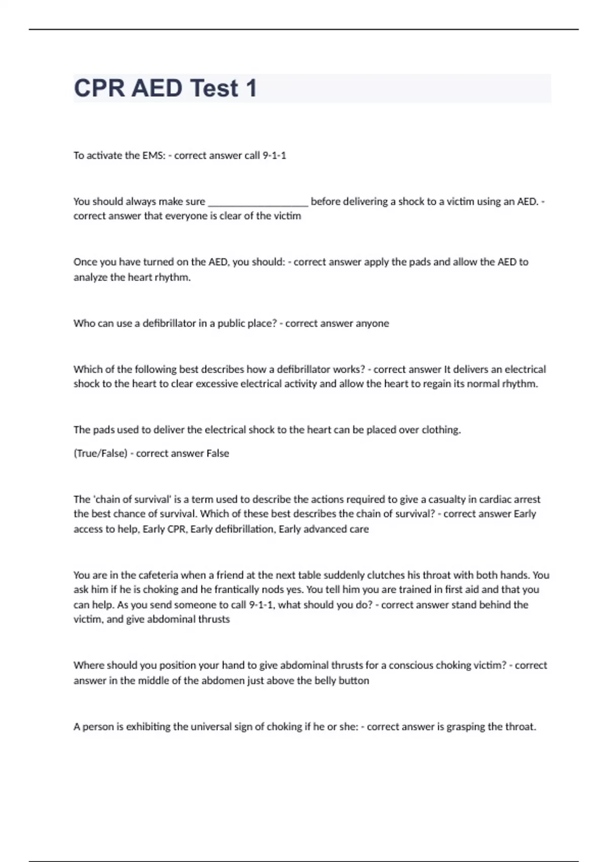 CPR AED Test 1 questions and 100% correct answers