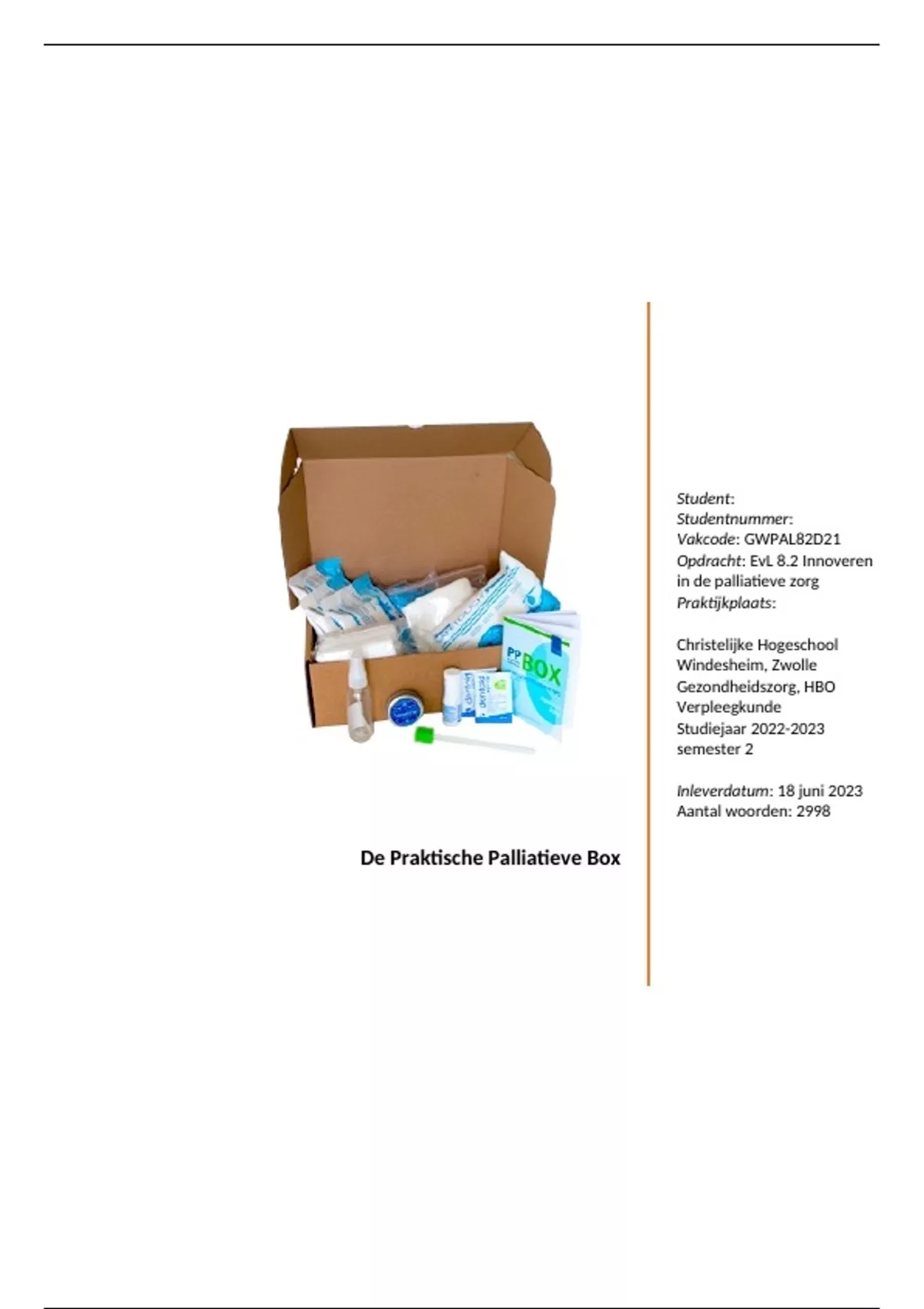 Voor u ligt het uitgewerkte implementatieplan voor de Praktisch Palliatieve Box te implementeren in
