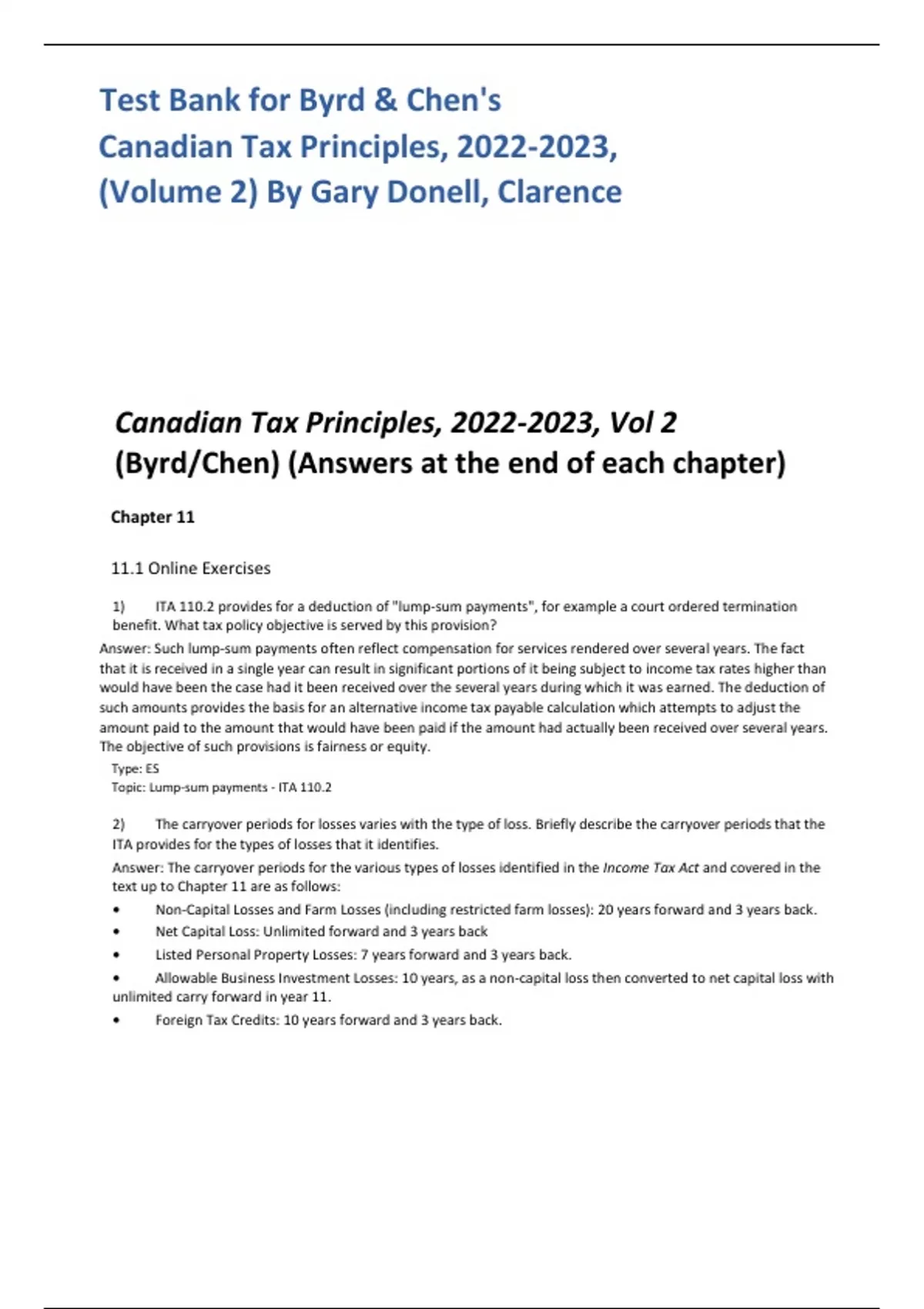 Test Bank for Byrd & Chen's Canadian Tax Principles (Volume 2) By Gary Donell Clarenc Test Bank for Byrd & Chen's Canadian Tax Principles (Volume 2) By Gary Donell Clarenc