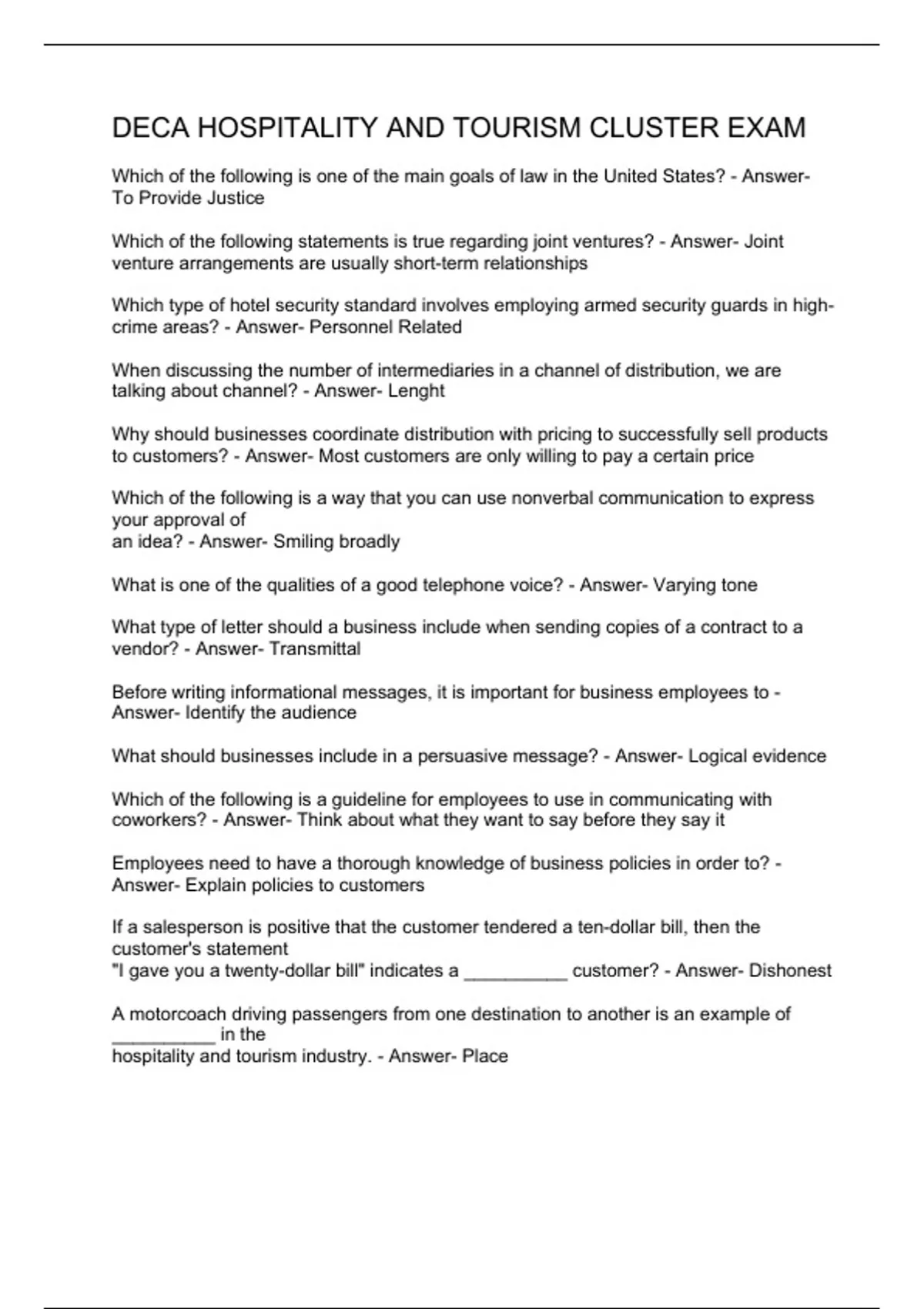 Which of the following is one of the main goals of law in the United States? - Answer- To Provide Justice Which of the following statements is true regarding joint ventures? - Answer- Joint venture arrangements are usually short-term relationships Which type of hotel security standard involves employing armed security guards in high-crime areas? - Answer- Personnel Related When discussing the number of intermediaries in a channel of distribution, we are talking about channel? - Answer- Lenght Why should businesses coordinate distribution with pricing to successfully sell products to customers? - Answer- Most customers are only willing to pay a certain price Which of the following is a way that you can use nonverbal communication to express your approval of an idea? - Answer- Smiling broadly What is one of the qualities of a good telephone voice? - Answer- Varying tone What type of letter should a business include when sending copies of a contract to a vendor? - Answer- Transmittal Before writing informational messages, it is important for business employees to - Answer- Identify the audience What should businesses include in a persuasive message? - Answer- Logical evidence Which of the following is a guideline for employees to use in communicating with coworkers? - Answer- Think about what they want to say before they say it Employees need to have a thorough knowledge of business policies in order to? - Answer- Explain policies to customers If a salesperson is positive that the customer tendered a ten-dollar bill, then the customer's statement "I gave you a twenty-dollar bill" indicates a __________ customer? - Answer- Dishonest A motorcoach driving passengers from one destination to another is an example of __________ in the hospitality and tourism industry. - Answer- Place