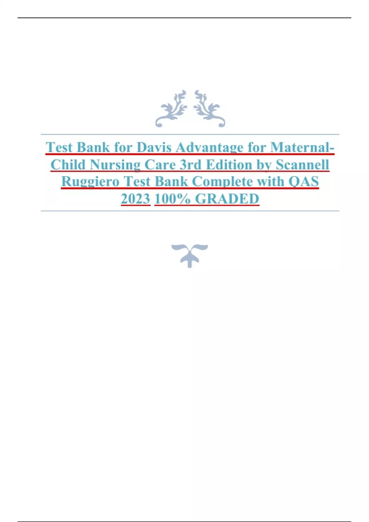 Access an instant, printable PDF featuring original Questions and Answers across Chapters 1 to 38. Crafted to support nursing students, this use... Davis Advantage for Maternal-Child Nursing Care 3rd Edition Scannell Ruggiero Test Bank Chapter 1.Core Concepts of Maternal and Pediatric Healthcare Across the Continuum MULTIPLE CHOICE Q 1. A patient chooses to have the certified nurse midwife (CNM) provide care during her pregnancy. What does the CNMs scope of practice include? • Practice independent from medical supervision • Comprehensive prenatal care • Attendance at all deliveries • Cesarean sections