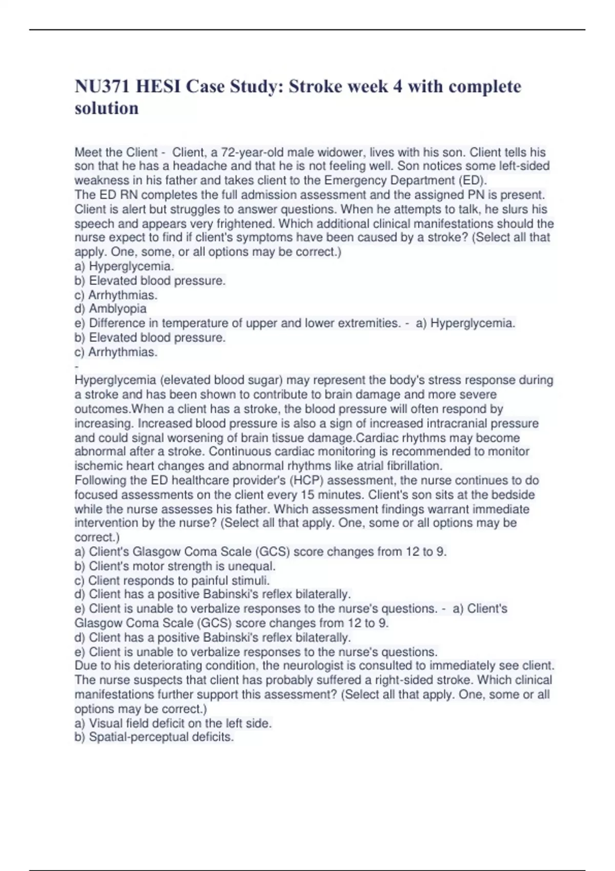 NU371 HESI Case Study: Stroke week 4 with complete solution Meet the Client - Client, a 72-year-old male widower, lives with his son. Client tells his son that he has a headache and that he is not feeling well. Son notices some left-sided weakness in his father and takes client to the Emergency Department (ED). The ED RN completes the full admission assessment and the assigned PN is present. Client is alert but struggles to answer questions. When he attempts to talk, he slurs his speech and appears very frightened. Which additional clinical manifestations should the nurse expect to find if client's symptoms have been caused by a stroke? (Select all that apply. One, some, or all options may be correct.) a) Hyperglycemia. b) Elevated blood pressure. c) Arrhythmias. d) Amblyopia e) Difference in temperature of upper and lower extremities. - a) Hyperglycemia. b) Elevated blood pressure. c) Arrhythmias. - Hyperglycemia (elevated blood sugar) may represent the body's stress response during a stroke and has been shown to contribute to brain damage and more severe outcomes.When a client has a stroke, the blood pressure will often respond by increasing. Increased blood pressure is also a sign of increased intracranial pressure and could signal worsening of brain tissue damage.Cardiac rhythms may become abnormal after a stroke. Continuous cardiac monitoring is recommended to monitor ischemic heart changes and abnormal rhythms like atrial fibrillation. Following the ED healthcare provider's (HCP) assessment, the nurse continues to do focused assessments on the client every 15 minutes. Client's son sits at the bedside while the nurse assesses his father. Which assessment findings warrant immediate intervention by the nurse? (Select all that apply. One, some or all options may be correct.) a) Client's Glasgow Coma Scale (GCS) score changes from 12 to 9. b) Client's motor strength is unequal. c) Client responds to painful stimuli. d) Client has a positive Babinski's reflex bilaterally. e) Client is unable to verbalize responses to the nurse's questions. - a) Client's Glasgow Coma Scale (GCS) score changes from 12 to 9. d) Client has a positive Babinski's reflex bilaterally. e) Client is unable to verbalize responses to the nurse's questions. Due to his deteriorating condition, the neurologist is consulted to immediately see client. The nurse suspects that client has probably suffered a right-sided stroke. Which clinical manifestations further support this assessment? (Select all that apply. One, some or all options may be correct.) a) Visual field deficit on the left side. b) Spatial-perceptual deficits. c) Full or partial paralysis of the left side: hemiplegia. d) Increased distractibility and attention span. e) Global aphasia. - a) Visual field deficit on the left side. b) Spatial-perceptual deficits. c) Full or partial paralysis of the left side: hemiplegia. d) Increased distractibility and attention span. The neurologist writes a diagnosis of "suspected stroke" and prescribes a computed tomography (CT) scan without contrast STAT. Which intervention should the nurse implement when preparing client and his son for this procedure? a) Determine if the client has any allergies to iodine or shellfish. b) Explain that the procedure requires the client to lie completely still. c) Offer client an anxiolytic prior to the procedure. d) Ensure that client does not have on any material that is metal, this includes metal prosthesis. - b) Explain that the procedure requires the client to lie completely still. - Because head motion will distort the images, client will have to remain still throughout the procedure. Since client has a decreased level of consciousness (LOC), he may require head support to accomplish this. The neurologist also prescribes a magnetic resonance imaging (MRI) of the head STAT. Which data warrants immediate intervention by the nurse concerning this diagnostic test? a) Elevated heart rate. b) Allergy to iodine. c) Left hip replacement. d) History of hypertension. - c) Left hip replacement. - The magnetic field generated by the MRI is so strong that metal-containing items are strongly attracted to the magnet. Because the hip joint is made of metal, a lead shield must be used during the procedure. Therapeutic Communication - Client is transferred to the Neurological Intensive Care Unit (ICU) after the MRI is completed. He has a 20 gauge saline lock in his right forearm and an 18 French indwelling urinary catheter. His son is sitting by his father's bed. The nurse asks the son if there is anyone who can be called so he won't be alone. He informs the nurse that his mother died 2 years ago and his closest relative is a cousin who lives out of state. The son states, "I don't understand what a stroke is. The HCP told me that my father is in serious condition and they are going to run several tests. I just don't know what is going on. What happened to my father?" Which explanation by the nurse is the most therapeutic response? a) "I am sorry, that information is protected by HIPAA." b) "Your father has had a stroke, and the blood supply to the brain has been compromised." c) "Why didn't you ask the HCP any questions?" d) "You can access information from the internet by using your cell phone." - b) "Your father has had a stroke, and the blood supply to the brain has been compromised." - The nurse has the knowledge and the responsibility, to explain client's condition to the son. The son is visibly upset and states, "Dad has been fine all week. We even went out to dinner. I love him so much and I am scared." How should the nurse respond? a) "I wouldn't worry if I were you, I am sure things be ok." b) "I know this is scary for you. Would you like to sit and talk?" c) "I can call your pastor to come and sit with you so you won't be alone." d) "Hang in there. Can you call a friend to come and sit with you until you feel better?" - b) "I know this is scary for you. Would you like to sit and talk?" - Thi