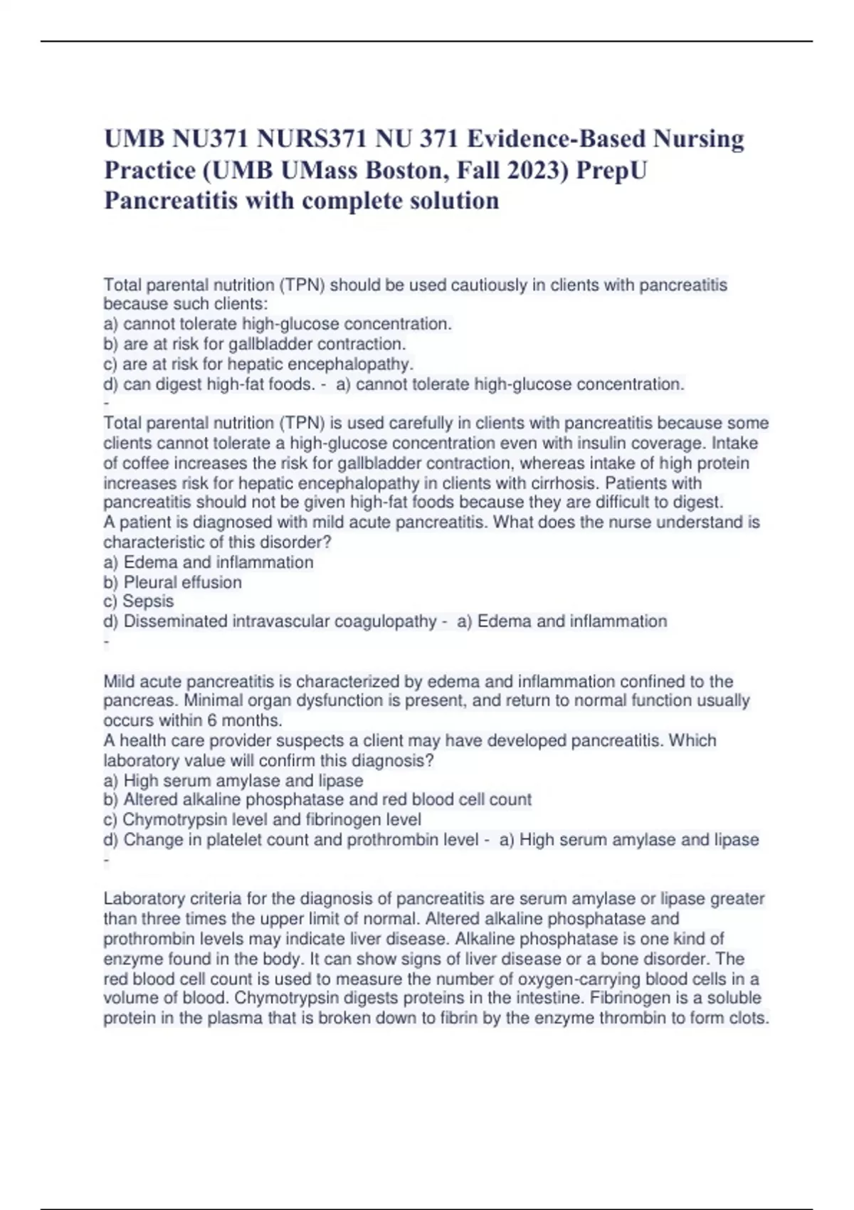 UMB NU371 NURS371 NU 371 Evidence-Based Nursing Practice (UMB UMass Boston, Fall 2023) PrepU Pancreatitis with complete solution