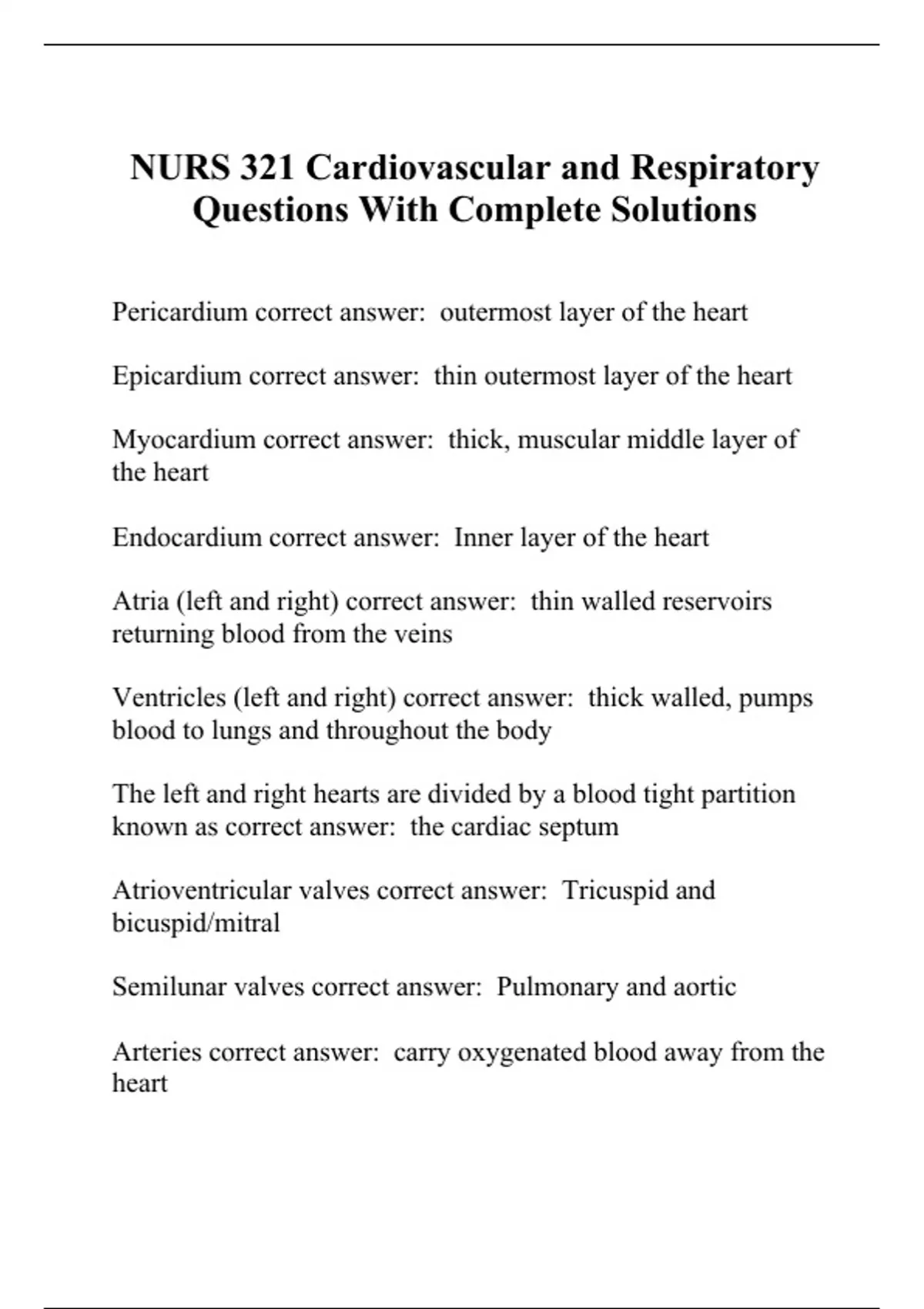 NURS 321 Cardiovascular and Respiratory Questions With Complete Solutions