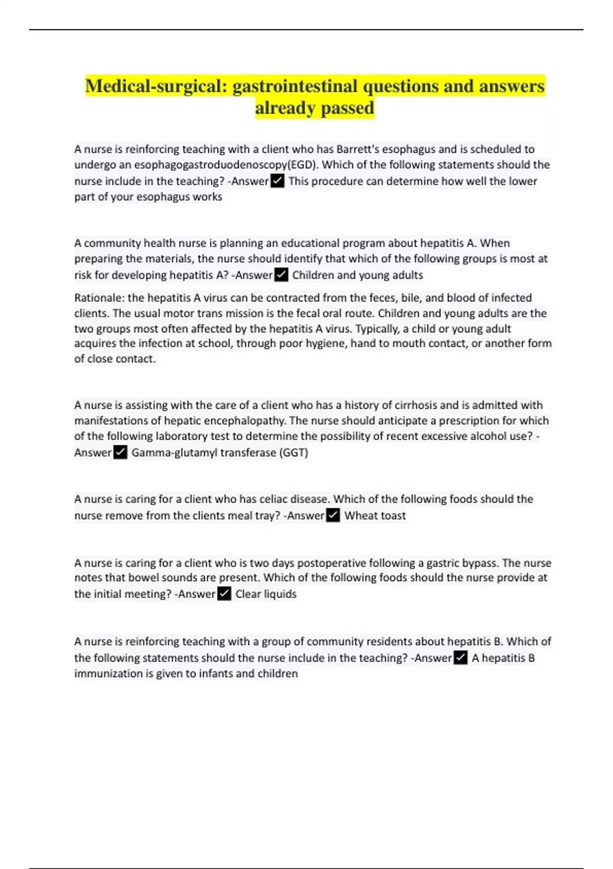 Medical-surgical: gastrointestinal questions and answers already passed A nurse is reinforcing teaching with a client who has Barrett's esophagus and is scheduled to undergo an esophagogastroduodenoscopy(EGD). Which of the following statements should the nurse include in the teaching? -Answer This procedure can determine how well the lower part of your esophagus works A community health nurse is planning an educational program about hepatitis A. When preparing the materials, the nurse should identify that which of the following groups is most at risk for developing hepatitis A? -Answer Children and young adults Rationale: the hepatitis A virus can be contracted from the feces, bile, and blood of infected clients. The usual motor trans mission is the fecal oral route. Children and young adults are the two groups most often affected by the hepatitis A virus. Typically, a child or young adult acquires the infection at school, through poor hygiene, hand to mouth contact, or another form of close contact. A nurse is assisting with the care of a client who has a history of cirrhosis and is admitted with manifestations of hepatic encephalopathy. The nurse should anticipate a prescription for which of the following laboratory test to determine the possibility of recent excessive alcohol use? -Answer Gamma-glutamyl transferase (GGT) A nurse is caring for a client who has celiac disease. Which of the following foods should the nurse remove from the clients meal tray? -Answer Wheat toast A nurse is caring for a client who is two days postoperative following a gastric bypass. The nurse notes that bowel sounds are present. Which of the following foods should the nurse provide at the initial meeting? -Answer Clear liquids A nurse is reinforcing teaching with a group of community residents about hepatitis B. Which of the following statements should the nurse include in the teaching? -Answer A hepatitis B immunization is given to infants and children A nurse is caring for a client who has a percutaneous endoscopic gastrostomy (PEG) tube and is receiving intermittent feedings. Prior to initiating the feeding, which of the following actions should the nurse take first? -Answer Place the client in semi Fowler's position. A client who is receiving a PEG tube feedings should be positioned with the head of the bed elevated at least 30° during and after feedings to decrease the risk of aspiration. A nurse is caring for a client who is scheduled to undergo a liver biopsy for a suspected malignancy. Which of the following laboratory findings should the nurse monitor prior to the procedure? -Answer Prothrombin time A major complication following a liver biopsy is hemorrhage. Many clients who have liver disease have clotting defects and are at risk for bleeding. Along with the PT, the activated partial thromboplastin time and a platelet count should be monitored. A nurse is collecting data from a client who is in the early stages of hepatitis A. Which of the following manifestations should the nurse expect? -Answer Anorexia Anorexia is an early manifestation of hepatitis A and is often severe. It is thought to result from the release of toxin by the damaged liver or by the failure of the damage liver cells to detoxify an abnormal product. A nurse is assisting with the admission of a client who has fulminate hepatic failure. Which of the following procedures should the nurse expect for this client? -Answer Liver transplant