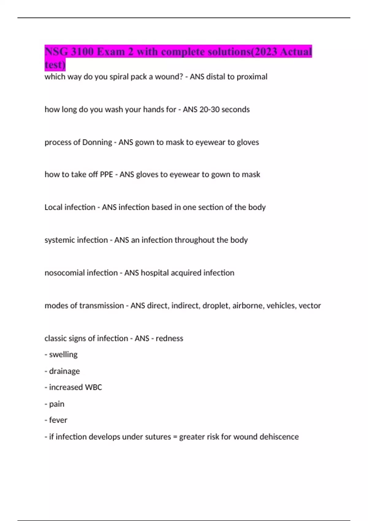 NSG 3100 Exam 2 with complete solutions(2023 Actual test) which way do you spiral pack a wound? - ANS distal to proximal how long do you wash your hands for - ANS 20-30 seconds process of Donning - ANS gown to mask to eyewear to gloves how to take off PPE - ANS gloves to eyewear to gown to mask Local infection - ANS infection based in one section of the body systemic infection - ANS an infection throughout the body nosocomial infection - ANS hospital acquired infection modes of transmission - ANS direct, indirect, droplet, airborne, vehicles, vector classic signs of infection - ANS - redness - swelling - drainage - increased WBC - pain - fever - if infection develops under sutures = greater risk for wound dehiscence